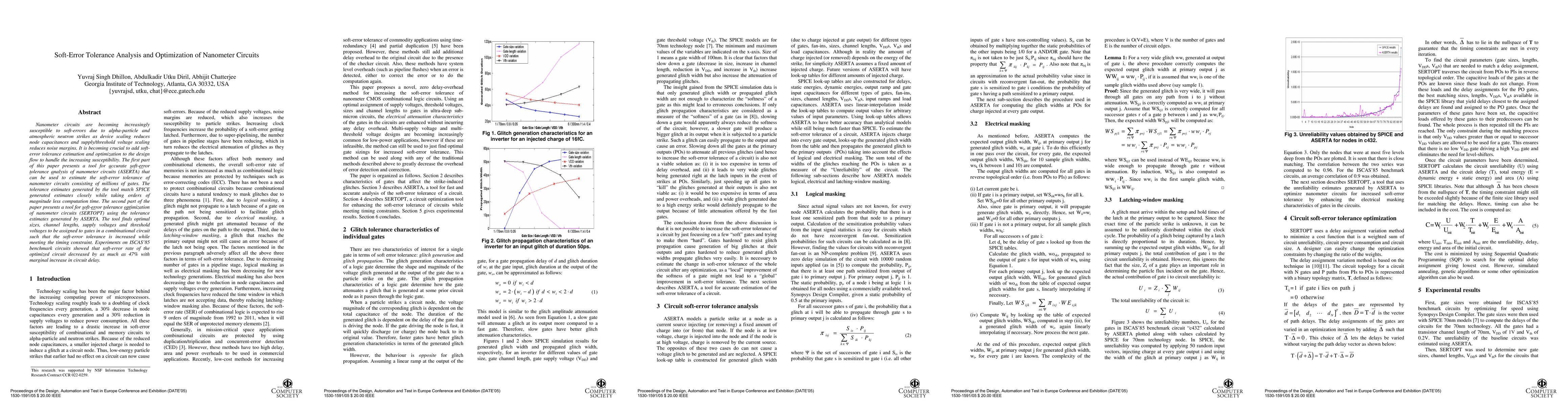 Nanometer circuits are becoming increasingly susceptible to soft-errors due to alpha-particle and atmospheric neutron strikes as device scaling reduces node capacitances and supply/threshold voltage scaling reduces noise margins. It is becoming crucial to add soft-error tolerance estimation and optimization to the design flow to handle the increasing susceptibility. The first part of this paper presents a tool for accurate soft-error tolerance analysis of nanometer circuits (ASERTA) that can be used to estimate the soft-error tolerance of nanometer circuits consisting of millions of gates. The tolerance estimates generated by the tool match SPICE generated estimates closely while taking orders of magnitude less computation time. The second part of the paper presents a tool for soft-error tolerance optimization of nanometer circuits (SERTOPT) using the tolerance estimates generated by ASERTA. The tool finds optimal sizes, channel lengths, supply voltages and threshold voltages to be assigned to gates in a combinational circuit such that the soft-error tolerance is increased while meeting the timing constraint. Experiments on ISCAS'85 benchmark circuits showed that soft-error rate of the optimized circuit decreased by as much as 47% with marginal increase in circuit delay.