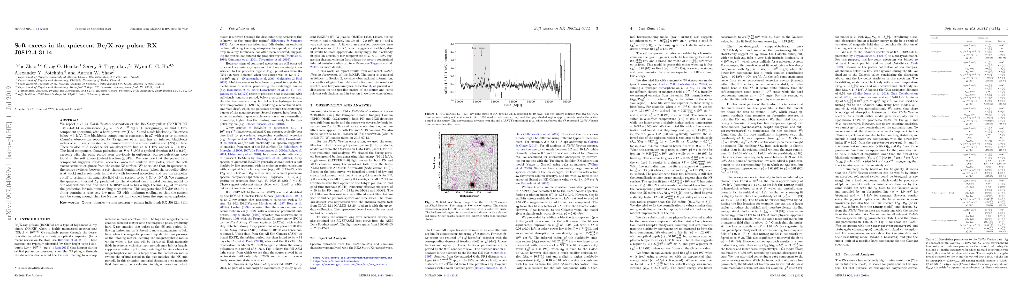 We report a 72 ks XMM-Newton observation of the Be/X-ray pulsar (BeXRP) RX J0812.4-3114 in quiescence ($L_X \approx 1.6 \times 10^{33}~\mathrm{erg~s^{-1}}$). Intriguingly, we find a two component spectrum, with a hard power-law ($\Gamma \approx 1.5$) and a soft blackbody-like excess below $\approx 1~\mathrm{keV}$. The blackbody component is consistent in $kT$ with a prior quiescent Chandra observation reported by Tsygankov et al. and has an inferred blackbody radius of $\approx 10~\mathrm{km}$, consistent with emission from the entire neutron star (NS) surface. There is also mild evidence for an absorption line at $\approx 1~\mathrm{keV}$ and/or $\approx 1.4~\mathrm{keV}$. The hard component shows pulsations at $P \approx 31.908~\mathrm{s}$ (pulsed fraction $0.84 \pm 0.10$), agreeing with the pulse period seen previously in outbursts, but no pulsations were found in the soft excess (pulsed fraction $\lesssim 31\%$). We conclude that the pulsed hard component suggests low-level accretion onto the neutron star poles, while the soft excess seems to originate from the entire NS surface. We speculate that, in quiescence, the source switches between a soft thermal-dominated state (when the propeller effect is at work) and a relatively hard state with low-level accretion, and use the propeller cutoff to estimate the magnetic field of the system to be $\lesssim 8.4 \times 10^{11}~\mathrm{G}$. We compare the quiescent thermal $L_X$ predicted by the standard deep crustal heating model to our observations and find that RX J0812.4-3114 has a high thermal $L_X$, at or above the prediction for minimum cooling mechanisms. This suggests that RX J0812.4-3114 either contains a relatively low-mass NS with minimum cooling, or that the system may be young enough that the NS has not fully cooled from the supernova explosion.