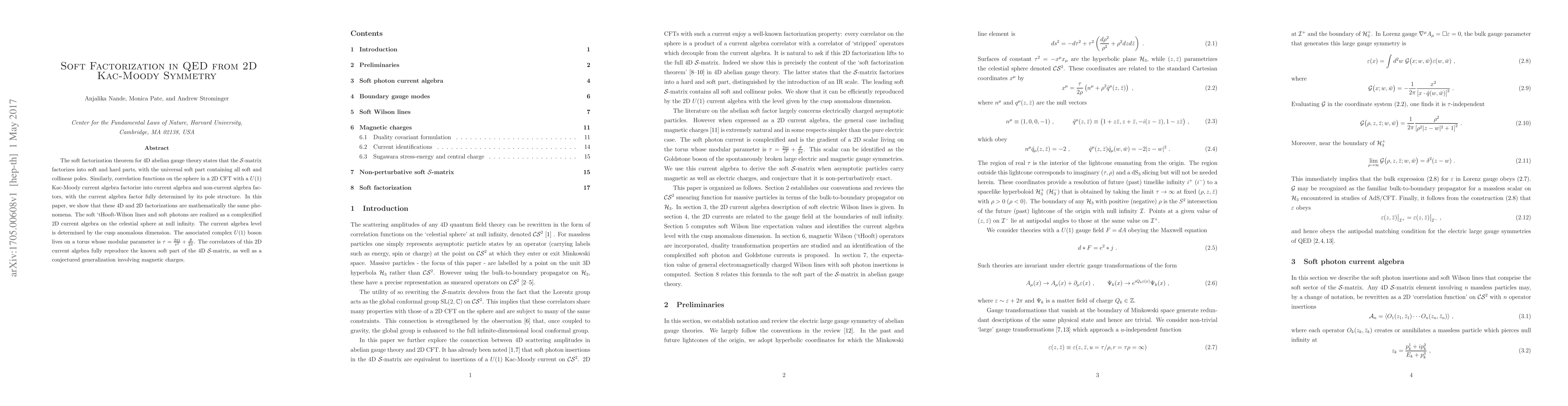 This paper demonstrates the equivalence of soft factorization in 4D QED and 2D CFTs with $U(1)$ Kac-Moody symmetry, showing that both factorizations are manifestations of the same mathematical phenomena. It utilizes a complexified 2D current algebra on the celestial sphere to reproduce the soft part of the 4D $\mathcal{S}$-matrix and conjectures a generalization involving magnetic charges.