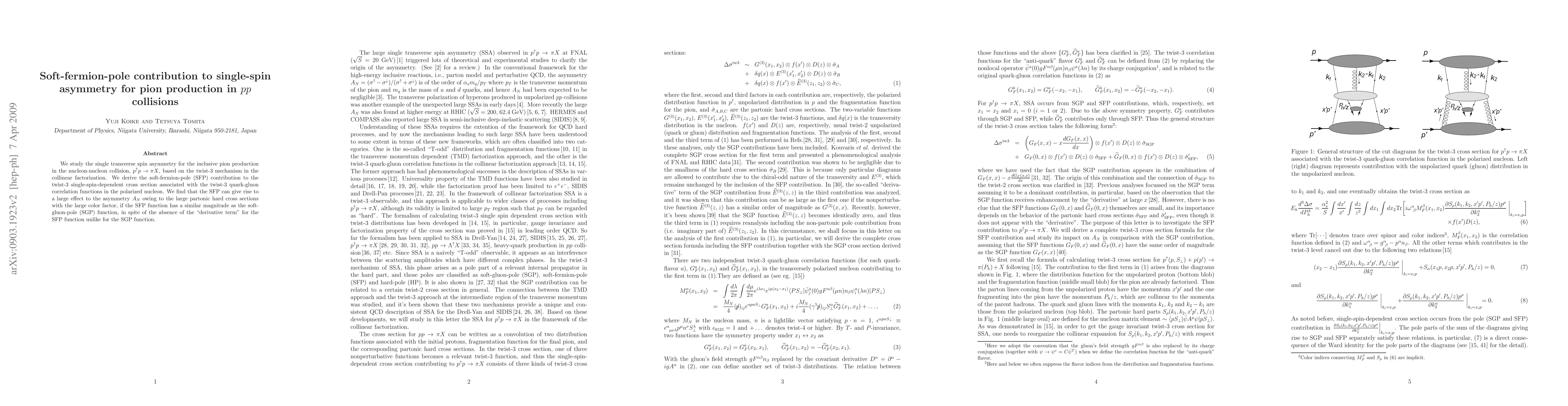 Researchers investigate the single-spin asymmetry for pion production in proton collisions, finding that a soft-fermion-pole contribution can significantly impact the asymmetry, despite its lack of a derivative term.