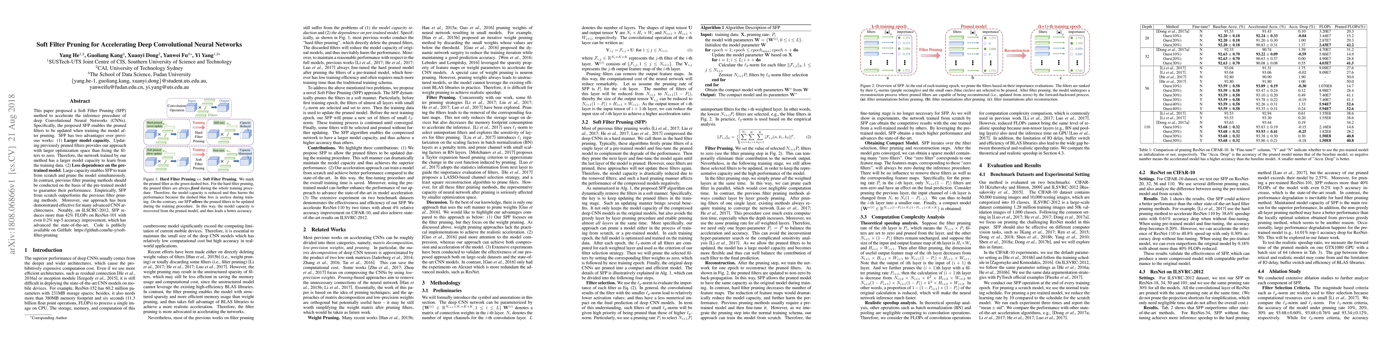 This paper introduces Soft Filter Pruning (SFP) to accelerate deep CNNs by allowing pruned filters to be updated during training, offering larger model capacity and less reliance on pre-trained models. SFP outperforms previous methods, achieving a 42% reduction in FLOPs on ResNet-101 with a 0.2% top-5 accuracy improvement on ILSCRC-2012.