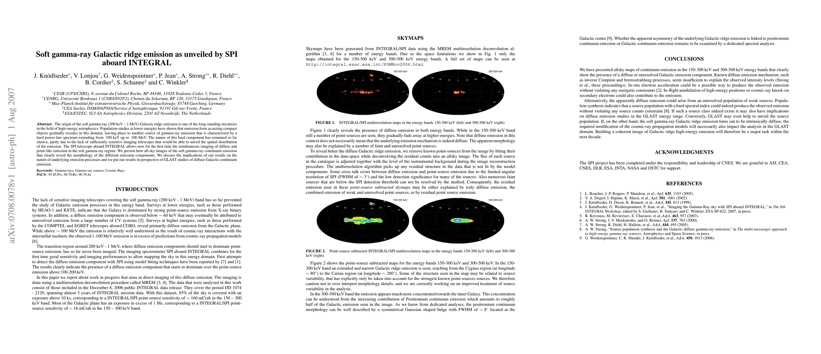This paper unveils the soft gamma-ray galactic ridge emission using the SPI telescope aboard INTEGRAL, revealing its morphology and suggesting new insights into its underlying emission processes, contrasting with previous studies limited by lower energy resolution. The findings are compared with GLAST studies of diffuse galactic emission.