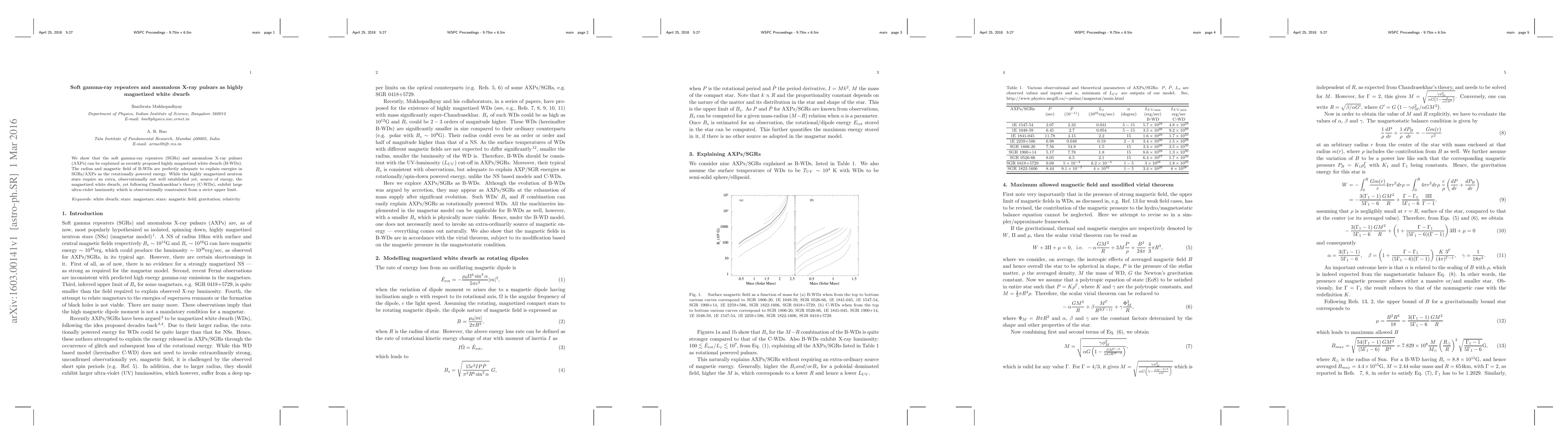We show that the soft gamma-ray repeaters (SGRs) and anomalous X-ray pulsars (AXPs) can be explained as recently proposed highly magnetized white dwarfs (B-WDs). The radius and magnetic field of B-WDs are perfectly adequate to explain energies in SGRs/AXPs as the rotationally powered energy. While the highly magnetized neutron stars require an extra, observationally not well established yet, source of energy, the magnetized white dwarfs, yet following Chandrasekhar's theory (C-WDs), exhibit large ultra-violet luminosity which is observationally constrained from a strict upper limit.