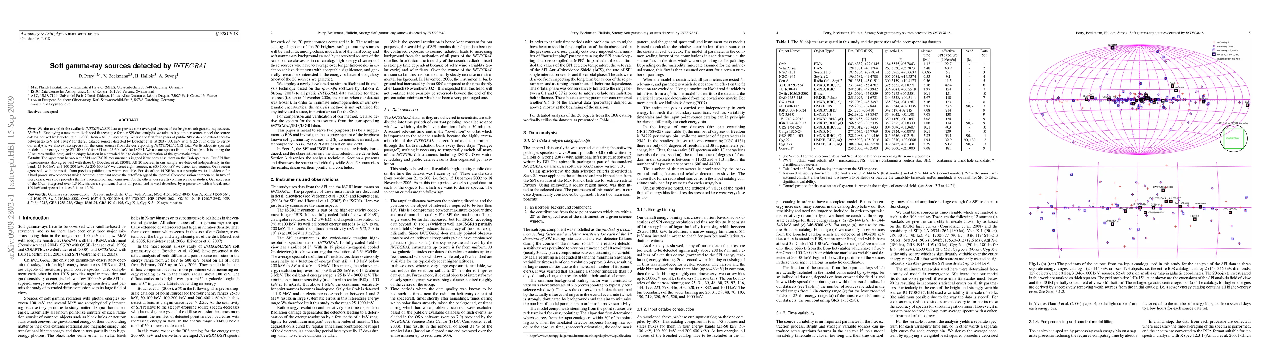 We aim to exploit the available INTEGRAL/SPI data to provide time-averaged spectra of the brightest soft gamma-ray sources. Employing a maximum-likelihood fit technique for our SPI data analysis, we take as input to our source model the source catalog derived by Bouchet et al. (2008) from a SPI all-sky study. We use the first four years of public SPI data and extract spectra between 25 keV and 1 MeV for the 20 catalog sources detected by Bouchet et al. at 200 - 600 keV with >= 2.5 sigma. In order to verify our analysis, we also extract spectra for the same sources from the corresponding INTEGRAL/ISGRI data. We fit adequate spectral models to the energy range 25-1000 keV for SPI and 25-600 keV for ISGRI. We use our spectra from the Crab (which is among the 20 sources studied here) and an empty location in a crowded field to derive an estimation of the systematic errors. The agreement between our SPI and ISGRI measurements is good if we normalise them on the Crab spectrum. Our SPI flux measurements also agree well with those by Bouchet et al. (2008). All 20 sources in our sample are detected independently in the bands 25-100 keV and 100-200 keV. At 200-600 keV we detect eight sources, at 600-1000 keV we detect two sources. Our spectra agree well with the results from previous publications where available. For six of the 14 XRBs in our sample we find evidence for a hard powerlaw-component which becomes dominant above the cutoff energy of the thermal Comptonization component. In two of these cases, our study provides the first indication of such emission. For the others, our results confirm previous studies. Our Crab spectrum (from 1.3 Ms exposure), shows a significant flux in all points and is well described by a powerlaw with a break near 100 keV and spectral indices 2.11 and 2.20.