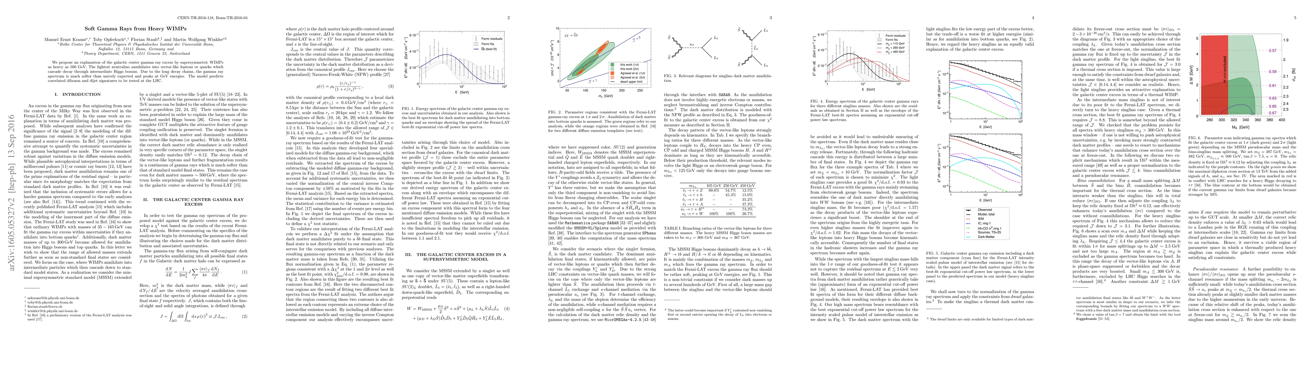 This paper proposes that heavy supersymmetric WIMPs could explain a gamma ray excess at the galactic center, with the lightest neutralino decaying into intermediate Higgs bosons, producing softer-than-expected gamma rays.