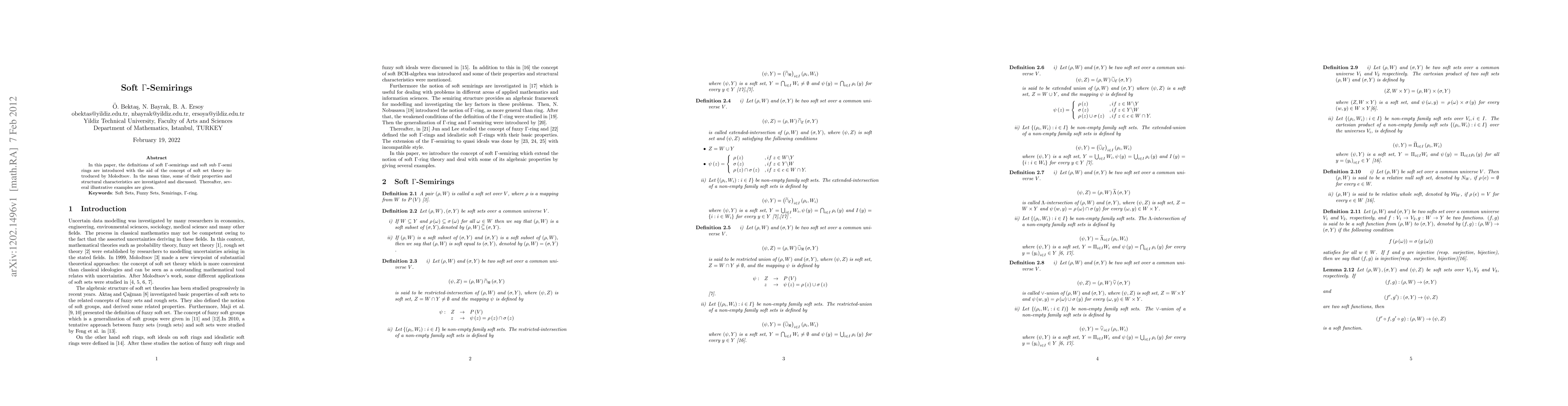 In this paper, the definitions of soft {\Gamma}-semirings and soft sub {\Gamma}-semi rings are introduced with the aid of the concept of soft set theory introduced by Molodtsov. In the mean time, some of their properties and structural characteristics are investigated and discussed. Thereafter, several illustrative examples are given.