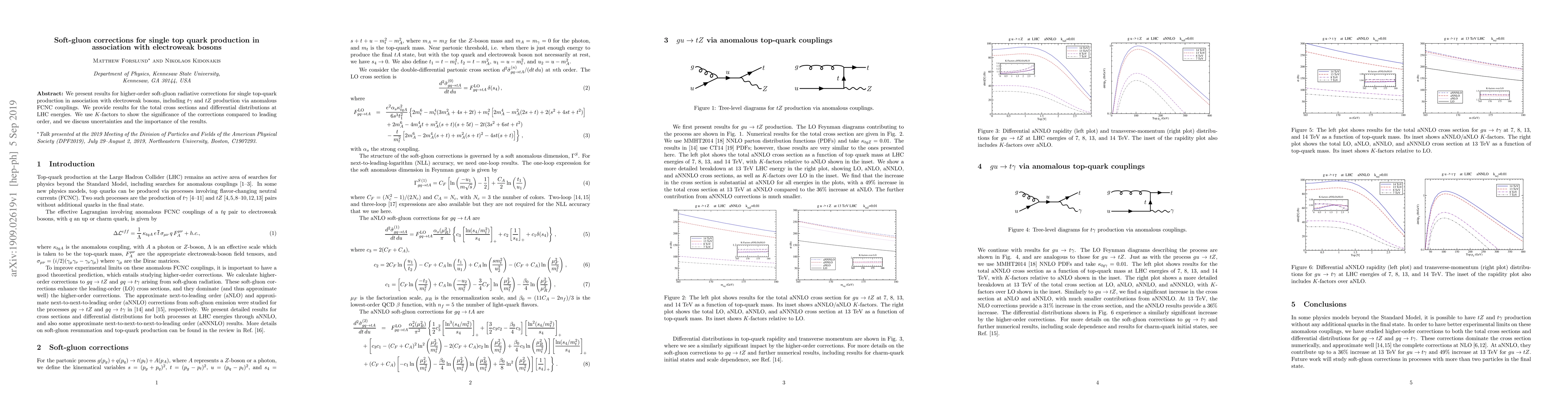 We present results for higher-order soft-gluon radiative corrections for single top-quark production in association with electroweak bosons, including $t\gamma$ and $tZ$ production via anomalous FCNC couplings. We provide results for the total cross sections and differential distributions at LHC energies. We use $K$-factors to show the significance of the corrections compared to leading order, and we discuss uncertainties and the importance of the results.