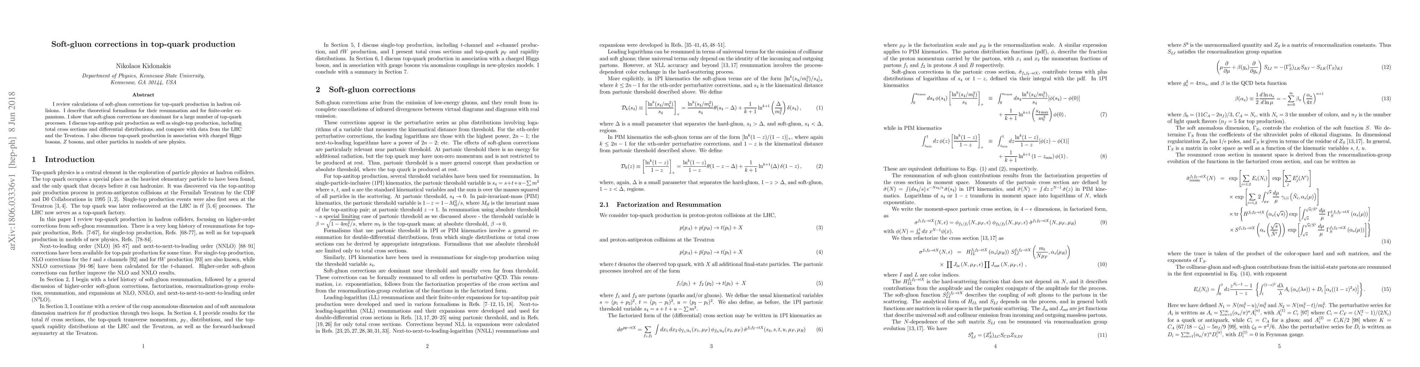 This paper reviews soft-gluon corrections in top-quark production, detailing their resummation and finite-order expansions, and demonstrates their dominance in various processes. It compares theoretical predictions with experimental data from the LHC and Tevatron, and explores top-quark production in new physics models.