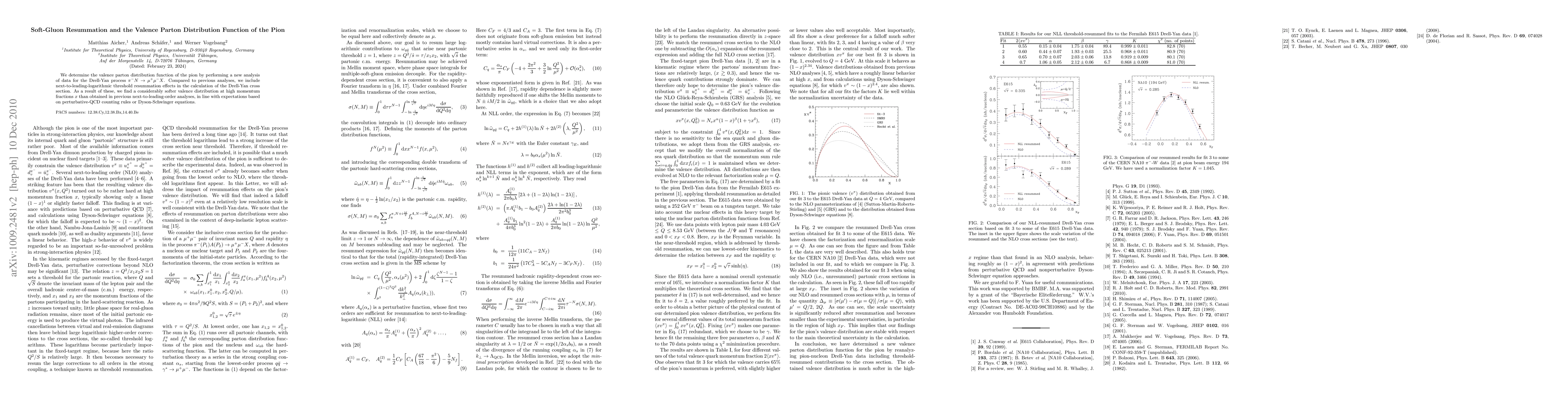 This paper presents a new analysis of the pion's valence parton distribution function using data from the Drell-Yan process, incorporating next-to-leading-logarithmic threshold resummation effects. The results show a significantly softer valence distribution at high momentum fractions compared to previous next-to-leading order analyses, aligning with theoretical predictions from perturbative QCD and Dyson-Schwinger equations.