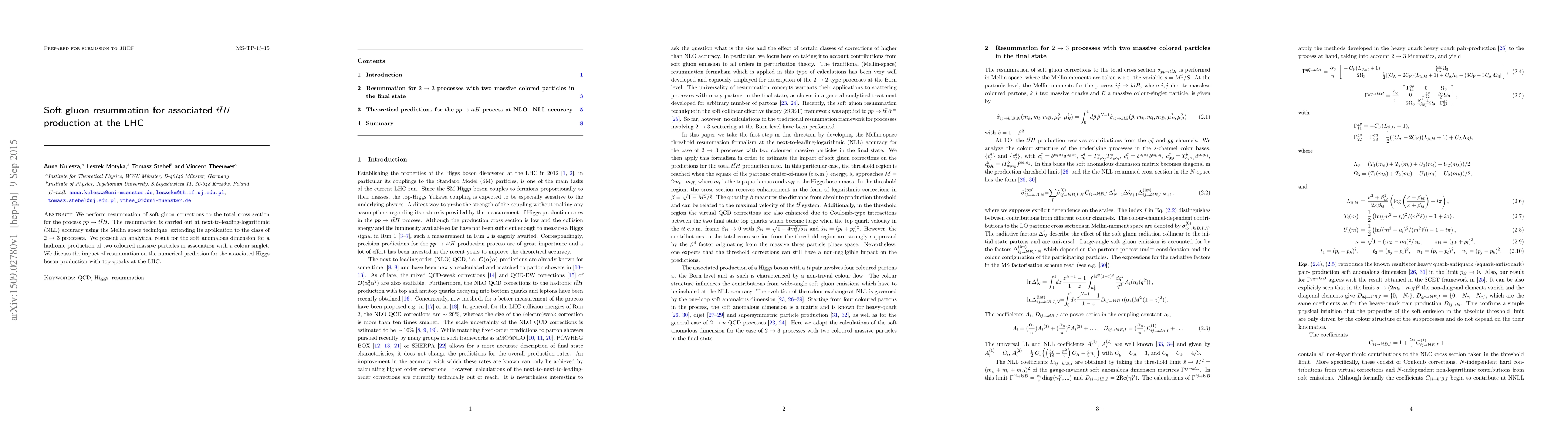 This paper performs resummation of soft gluon corrections at next-to-leading-logarithmic accuracy for the $pp \to t\bar{t}H$ process at the LHC using the Mellin space technique, presenting an analytical result for the soft anomalous dimension. The study discusses the impact of this resummation on the numerical prediction for associated Higgs production with top quarks.