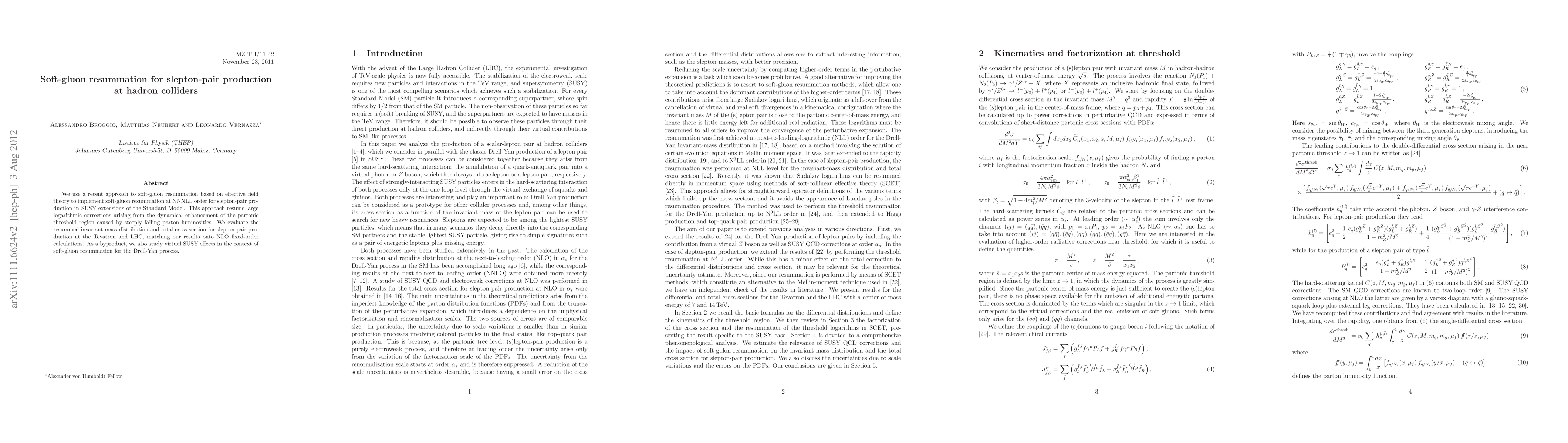 This paper implements soft-gluon resummation at NNNLL order for slepton-pair production in SUSY models, significantly enhancing the accuracy of predictions for such processes at hadron colliders. The study also explores virtual SUSY effects in the Drell-Yan process as a byproduct.