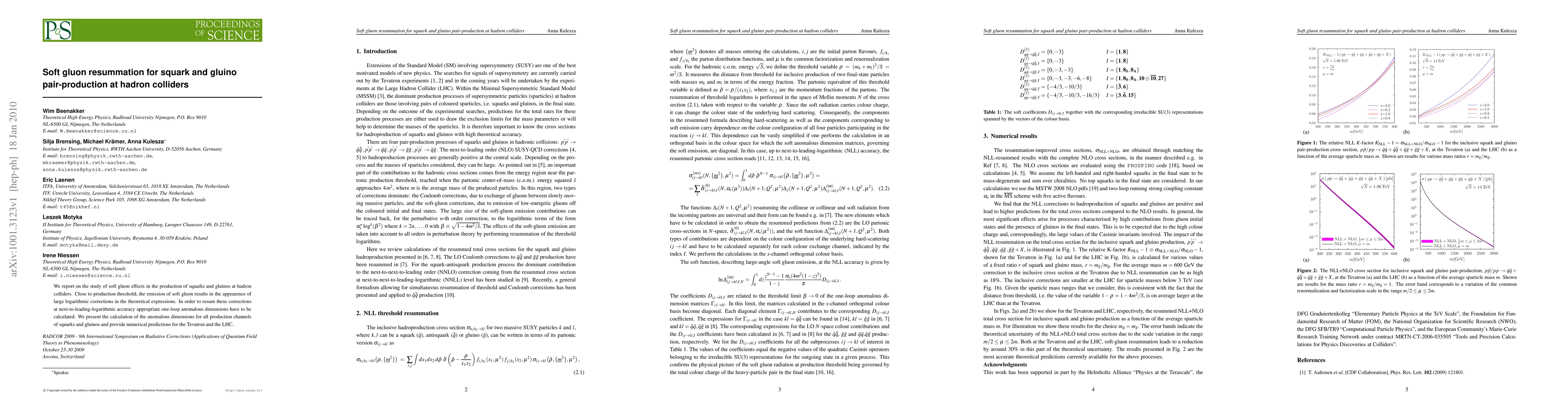 We report on the study of soft gluon effects in the production of squarks and gluinos at hadron colliders. Close to production threshold, the emission of soft gluon results in the appearence of large logarithmic corrections in the theoretical expressions. In order to resum these corrections at next-to-leading-logarithmic accuracy appropriate one-loop anomalous dimensions have to be calculated. We present the calculation of the anomalous dimensions for all production channels of squarks and gluinos and provide numerical predictions for the Tevatron and the LHC.
