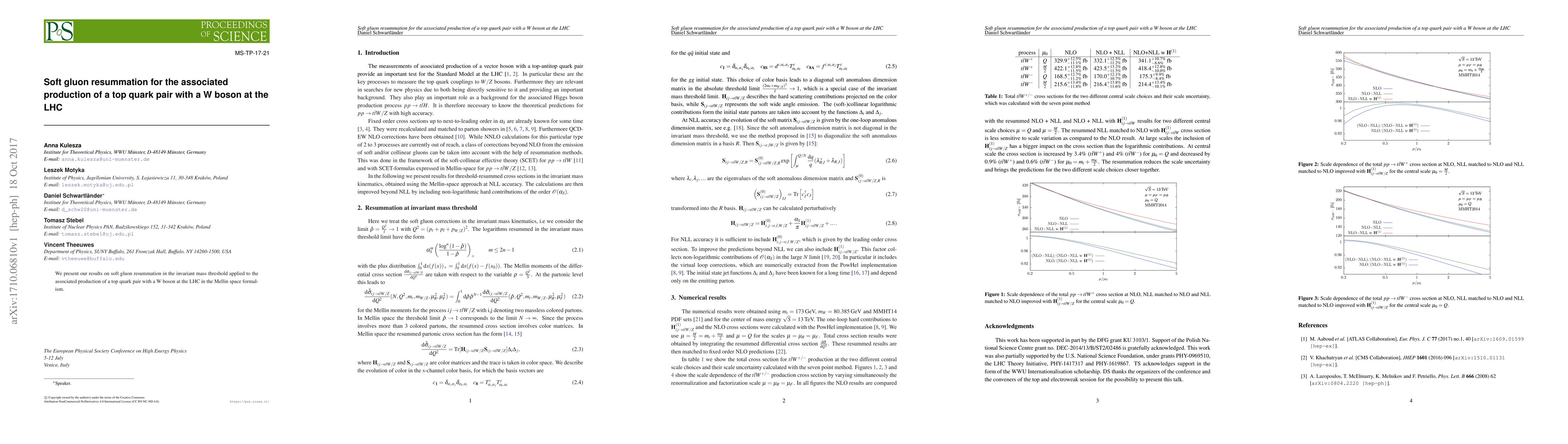 We present our results on soft gluon resummation in the invariant mass threshold applied to the associated production of a top quark pair with a W boson at the LHC in the Mellin space formalism.