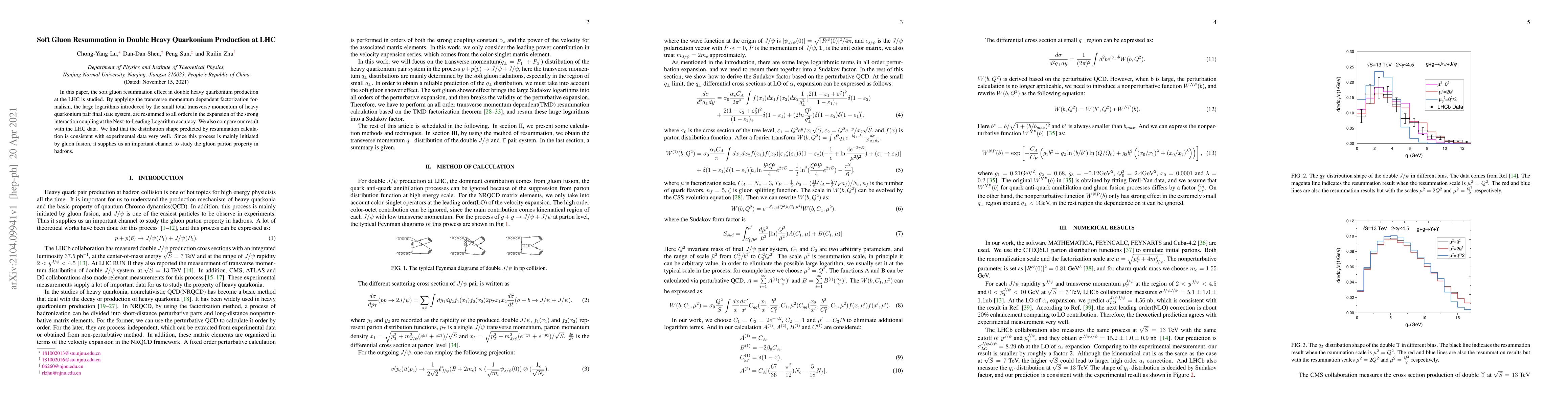 This paper studies the soft gluon resummation effect in double heavy quarkonium production at the LHC, applying a transverse momentum dependent factorization formalism to resum large logarithms. The results show good consistency with LHC data, providing insights into gluon parton properties in hadrons.