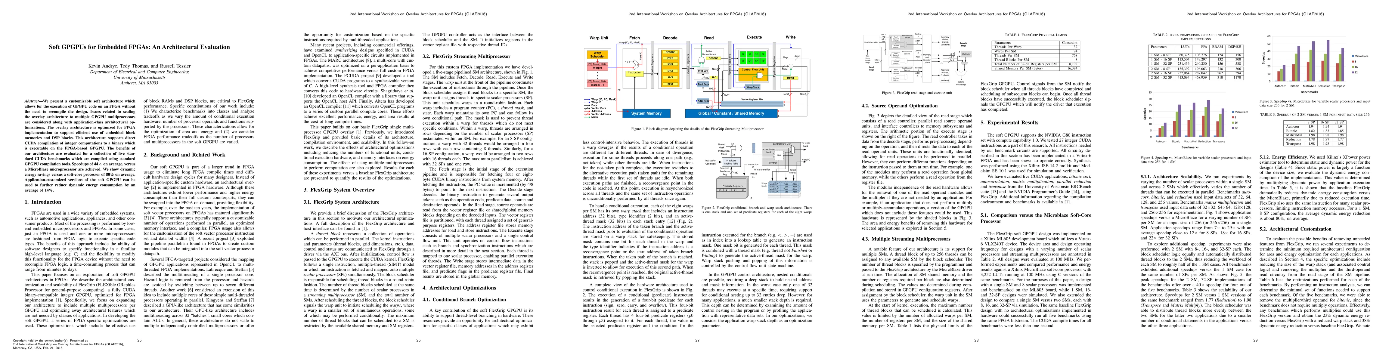 We present a customizable soft architecture which allows for the execution of GPGPU code on an FPGA without the need to recompile the design. Issues related to scaling the overlay architecture to multiple GPGPU multiprocessors are considered along with application-class architectural optimizations. The overlay architecture is optimized for FPGA implementation to support efficient use of embedded block memories and DSP blocks. This architecture supports direct CUDA compilation of integer computations to a binary which is executable on the FPGA-based GPGPU. The benefits of our architecture are evaluated for a collection of five standard CUDA benchmarks which are compiled using standard GPGPU compilation tools. Speedups of 44x, on average, versus a MicroBlaze microprocessor are achieved. We show dynamic energy savings versus a soft-core processor of 80% on average. Application-customized versions of the soft GPGPU can be used to further reduce dynamic energy consumption by an average of 14%.