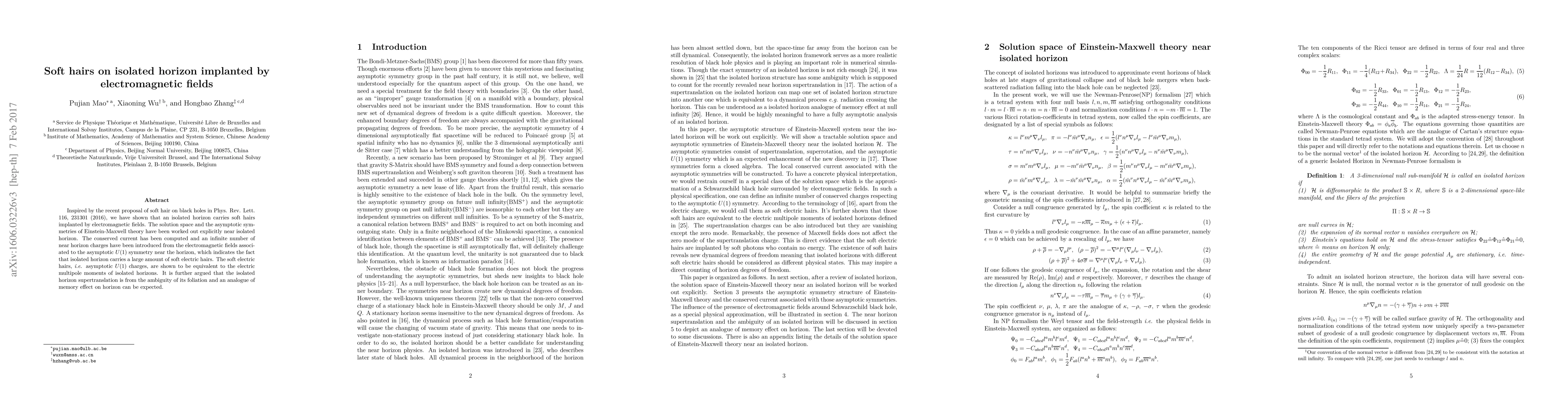 This paper explores the presence of soft hairs on isolated horizons due to electromagnetic fields, revealing an infinite number of near-horizon charges corresponding to the asymptotic $U(1)$ symmetry. It concludes that these soft electric hairs are analogous to electric multipole moments and suggests a memory effect analogous to gravitational memory on the horizon.
