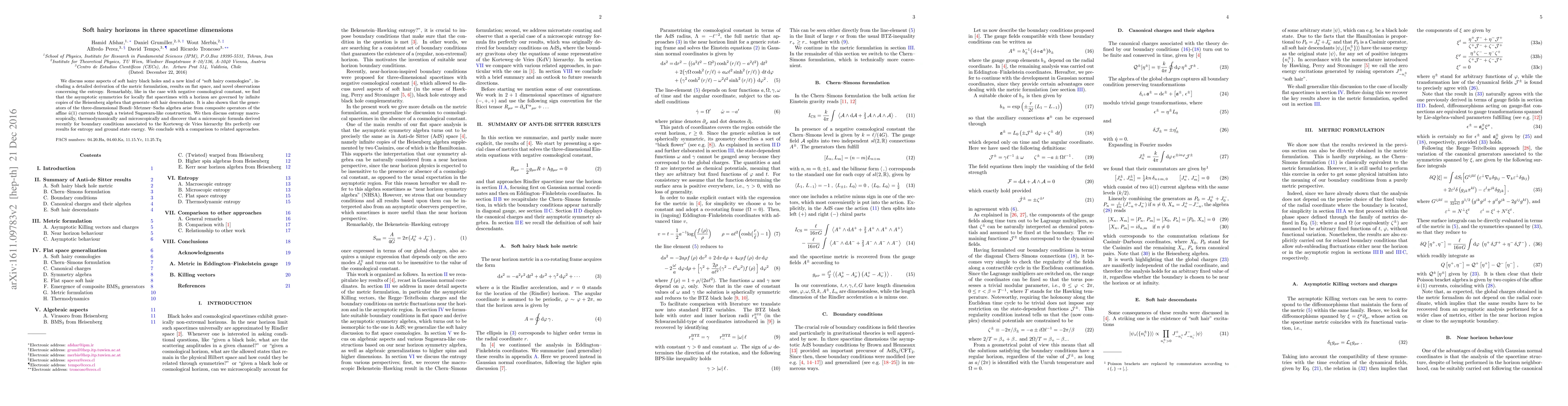 We discuss some aspects of soft hairy black holes and a new kind of "soft hairy cosmologies", including a detailed derivation of the metric formulation, results on flat space, and novel observations concerning the entropy. Remarkably, like in the case with negative cosmological constant, we find that the asymptotic symmetries for locally flat spacetimes with a horizon are governed by infinite copies of the Heisenberg algebra that generate soft hair descendants. It is also shown that the generators of the three-dimensional Bondi-Metzner-Sachs algebra arise from composite operators of the affine u(1) currents through a twisted Sugawara-like construction. We then discuss entropy macroscopically, thermodynamically and microscopically and discover that a microscopic formula derived recently for boundary conditions associated to the Korteweg-de Vries hierarchy fits perfectly our results for entropy and ground state energy. We conclude with a comparison to related approaches.
