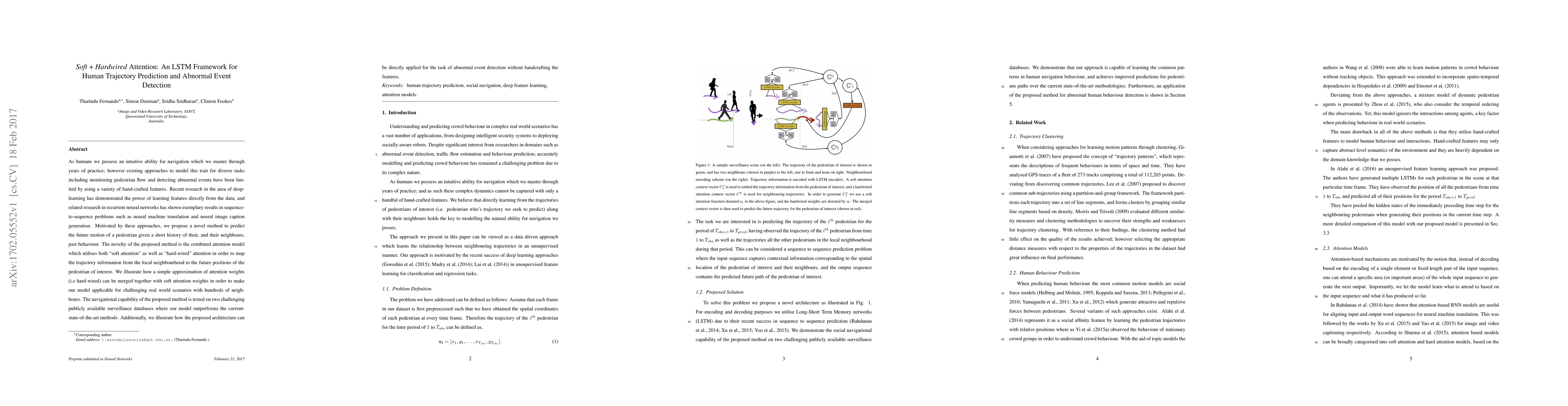 As humans we possess an intuitive ability for navigation which we master through years of practice; however existing approaches to model this trait for diverse tasks including monitoring pedestrian flow and detecting abnormal events have been limited by using a variety of hand-crafted features. Recent research in the area of deep-learning has demonstrated the power of learning features directly from the data; and related research in recurrent neural networks has shown exemplary results in sequence-to-sequence problems such as neural machine translation and neural image caption generation. Motivated by these approaches, we propose a novel method to predict the future motion of a pedestrian given a short history of their, and their neighbours, past behaviour. The novelty of the proposed method is the combined attention model which utilises both "soft attention" as well as "hard-wired" attention in order to map the trajectory information from the local neighbourhood to the future positions of the pedestrian of interest. We illustrate how a simple approximation of attention weights (i.e hard-wired) can be merged together with soft attention weights in order to make our model applicable for challenging real world scenarios with hundreds of neighbours. The navigational capability of the proposed method is tested on two challenging publicly available surveillance databases where our model outperforms the current-state-of-the-art methods. Additionally, we illustrate how the proposed architecture can be directly applied for the task of abnormal event detection without handcrafting the features.