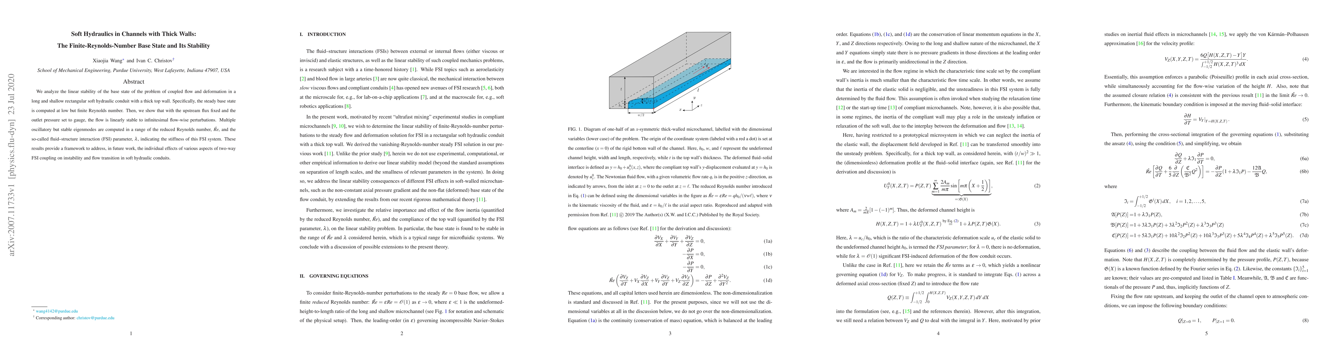 We analyze the linear stability of the base state of the problem of coupled flow and deformation in a long and shallow rectangular soft hydraulic conduit with a thick top wall. Specifically, the steady base state is computed at low but finite Reynolds number. Then, we show that with the upstream flux fixed and the outlet pressure set to gauge, the flow is linearly stable to infinitesimal flow-wise perturbations. Multiple oscillatory but stable eigenmodes are computed in a range of the reduced Reynolds number, $\hat{Re}$, and the so-called fluid--structure interaction (FSI) parameter, $\lambda$, indicating the stiffness of this FSI system. These results provide a framework to address, in future work, the individual effects of various aspects of two-way FSI coupling on instability and flow transition in soft hydraulic conduits.