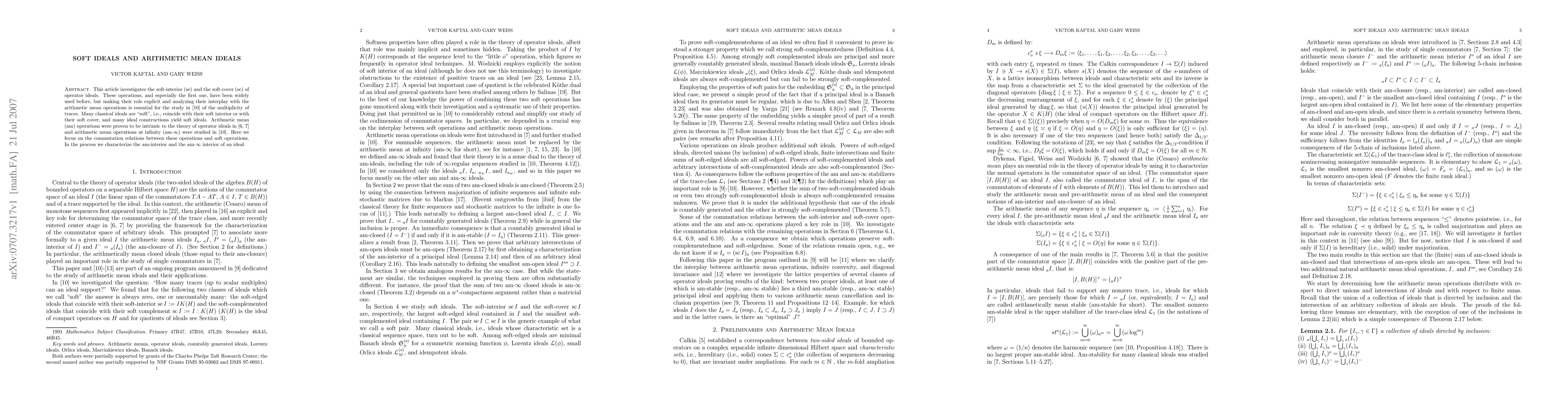 This article investigates the soft-interior and the soft-cover of operator ideals. These operations, and especially the first one, have been widely used before, but making their role explicit and analyzing their interplay with the arithmetic mean operations is essential for the study of the multiplicity of traces (see arXiv:0707.3169v1 [math.FA]). Many classical ideals are "soft", i.e., coincide with their soft interior or with their soft cover, and many ideal constructions yield soft ideals. Arithmetic mean (am) operations were proven to be intrinsic to the theory of operator ideals by the work of Dykema, Figiel, Weiss, and Wodzicki on the structure of commutators and arithmetic mean operations at infinity were studied in arXiv:0707.3169v1 [math.FA]. Here we focus on the commutation relations between these operations and soft operations. In the process we characterize the am-interior and the am-infinity interior of an ideal.