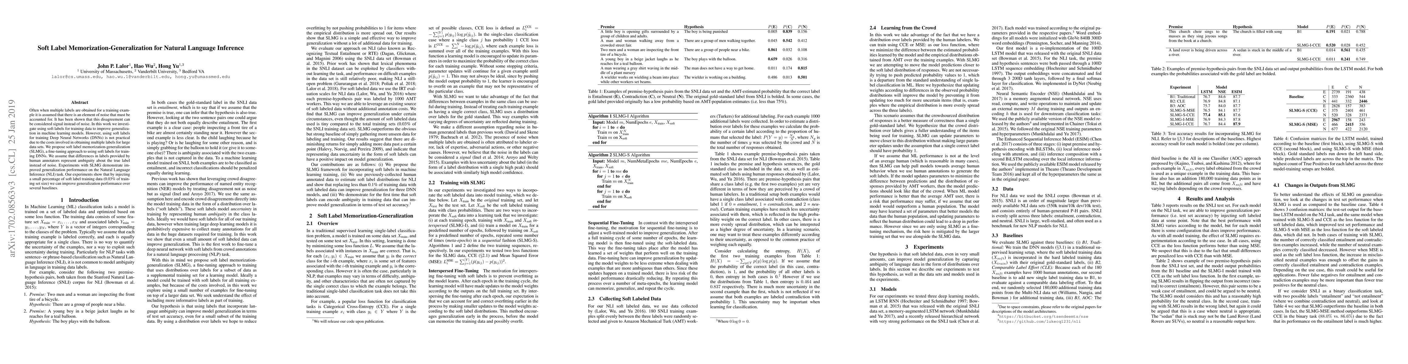 Often when multiple labels are obtained for a training example it is assumed that there is an element of noise that must be accounted for. It has been shown that this disagreement can be considered signal instead of noise. In this work we investigate using soft labels for training data to improve generalization in machine learning models. However, using soft labels for training Deep Neural Networks (DNNs) is not practical due to the costs involved in obtaining multiple labels for large data sets. We propose soft label memorization-generalization (SLMG), a fine-tuning approach to using soft labels for training DNNs. We assume that differences in labels provided by human annotators represent ambiguity about the true label instead of noise. Experiments with SLMG demonstrate improved generalization performance on the Natural Language Inference (NLI) task. Our experiments show that by injecting a small percentage of soft label training data (0.03% of training set size) we can improve generalization performance over several baselines.