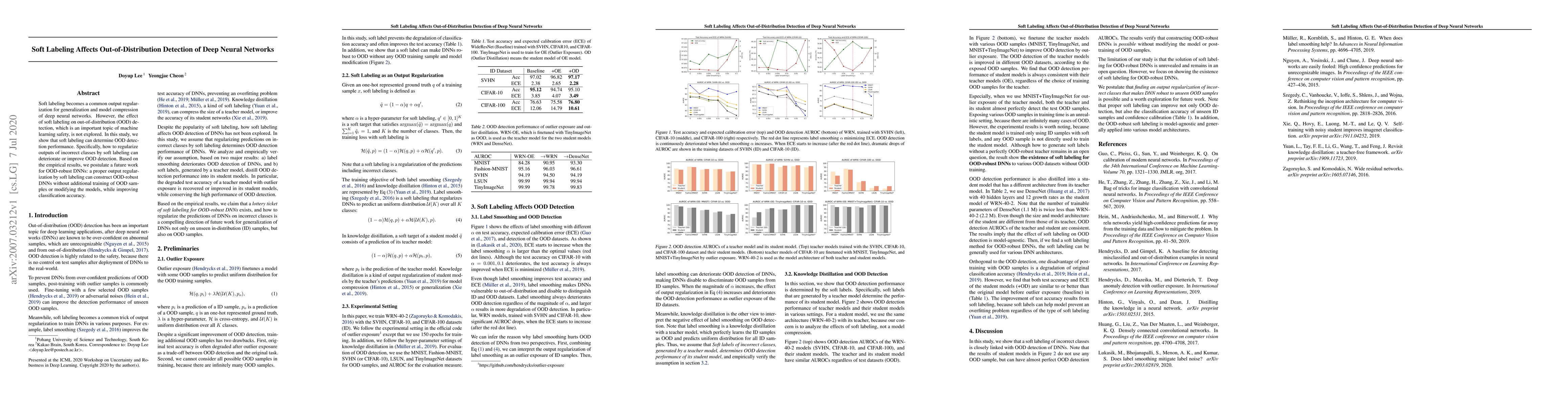 Soft labeling becomes a common output regularization for generalization and model compression of deep neural networks. However, the effect of soft labeling on out-of-distribution (OOD) detection, which is an important topic of machine learning safety, is not explored. In this study, we show that soft labeling can determine OOD detection performance. Specifically, how to regularize outputs of incorrect classes by soft labeling can deteriorate or improve OOD detection. Based on the empirical results, we postulate a future work for OOD-robust DNNs: a proper output regularization by soft labeling can construct OOD-robust DNNs without additional training of OOD samples or modifying the models, while improving classification accuracy.