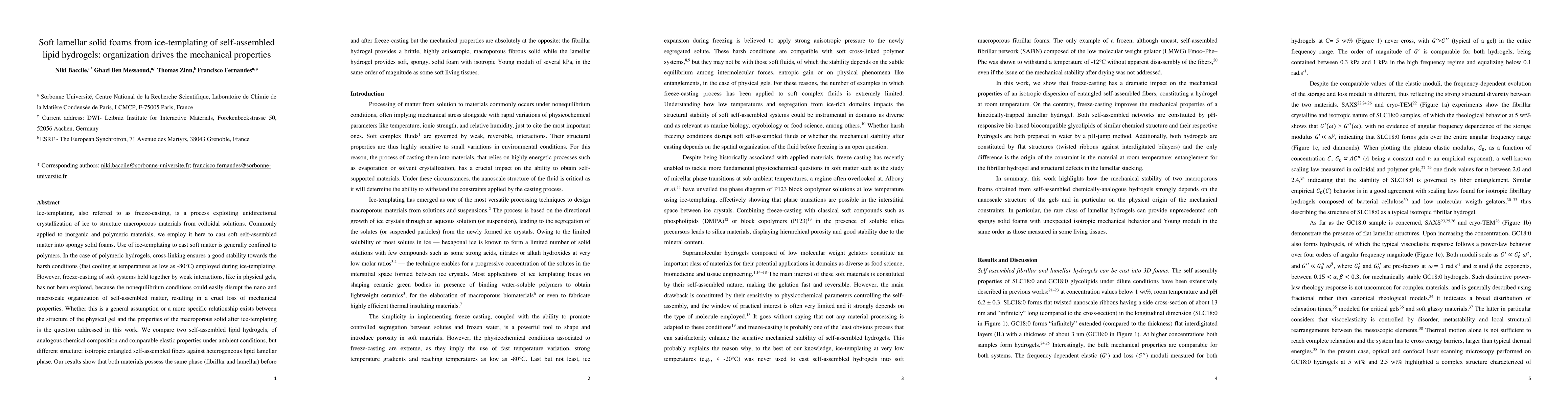 This research explores the use of ice-templating to create macroporous solid foams from self-assembled lipid hydrogels, demonstrating that the structural organization of the hydrogel significantly influences the mechanical properties of the resultant foam. The study finds that while both isotropic and lamellar lipid hydrogels maintain their phase after freeze-casting, only the lamellar structure results in a soft, spongy foam with isotropic mechanical properties comparable to soft living tissues.