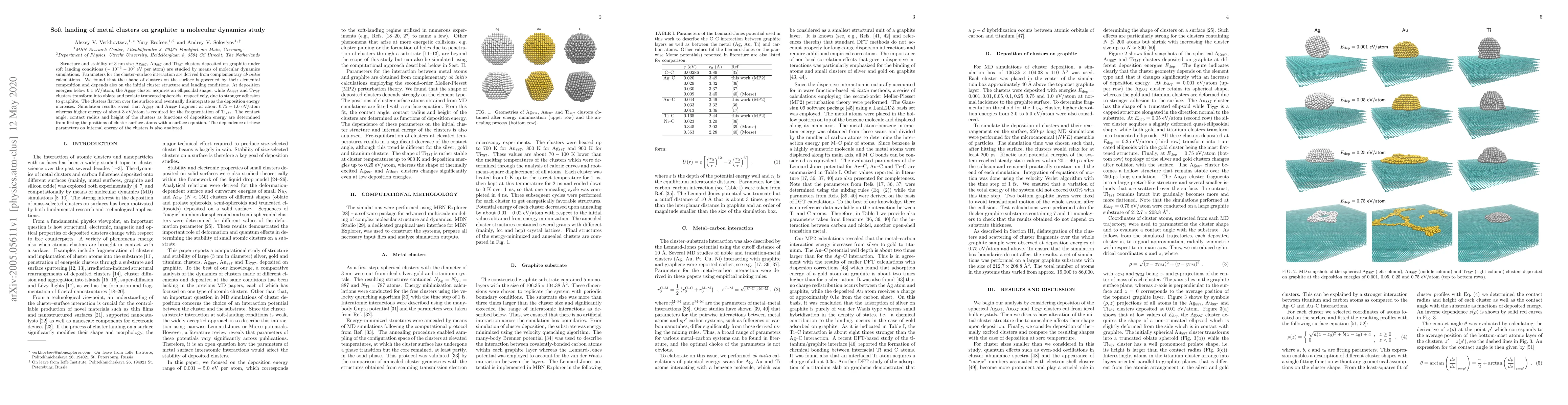 Structure and stability of 3 nm size Ag$_{887}$, Au$_{887}$ and Ti$_{787}$ clusters deposited on graphite under soft-landing conditions ($\sim 10^{-3}- 10^0$ eV per atom) are studied by means of molecular dynamics simulations. Parameters for the cluster-surface interaction are derived from complementary ab initio calculations. We found that the shape of clusters on the surface is governed by their elemental composition and depends also on the initial cluster structure and landing conditions. At deposition energies below 0.1 eV/atom, the Ag$_{887}$ cluster acquires an ellipsoidal shape, while Au$_{887}$ and Ti$_{787}$ clusters transform into oblate and prolate truncated spheroids, respectively, due to stronger adhesion to graphite. The clusters flatten over the surface and eventually disintegrate as the deposition energy increases. Simulation results reveal that Ag$_{887}$ and Au$_{887}$ fragment at about $0.75 - 1.0$ eV/atom whereas higher energy of about 3 eV/atom is required for the fragmentation of Ti$_{787}$. The contact angle, contact radius and height of the clusters as functions of deposition energy are determined from fitting the positions of cluster surface atoms with a surface equation. The dependence of these parameters on the internal energy of the clusters is also analyzed.