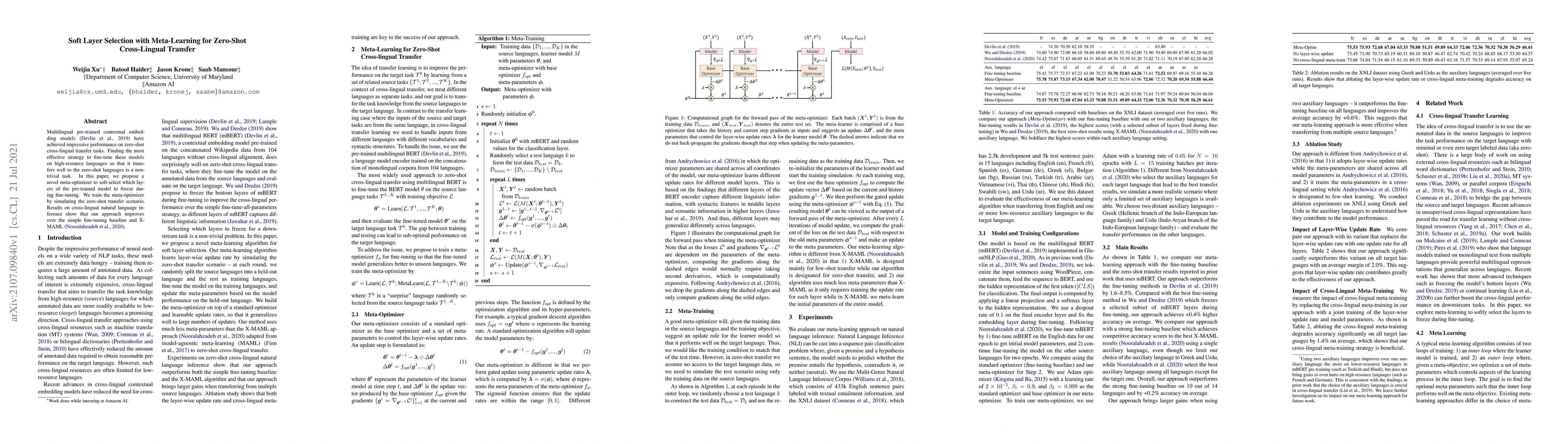 Multilingual pre-trained contextual embedding models (Devlin et al., 2019) have achieved impressive performance on zero-shot cross-lingual transfer tasks. Finding the most effective fine-tuning strategy to fine-tune these models on high-resource languages so that it transfers well to the zero-shot languages is a non-trivial task. In this paper, we propose a novel meta-optimizer to soft-select which layers of the pre-trained model to freeze during fine-tuning. We train the meta-optimizer by simulating the zero-shot transfer scenario. Results on cross-lingual natural language inference show that our approach improves over the simple fine-tuning baseline and X-MAML (Nooralahzadeh et al., 2020).