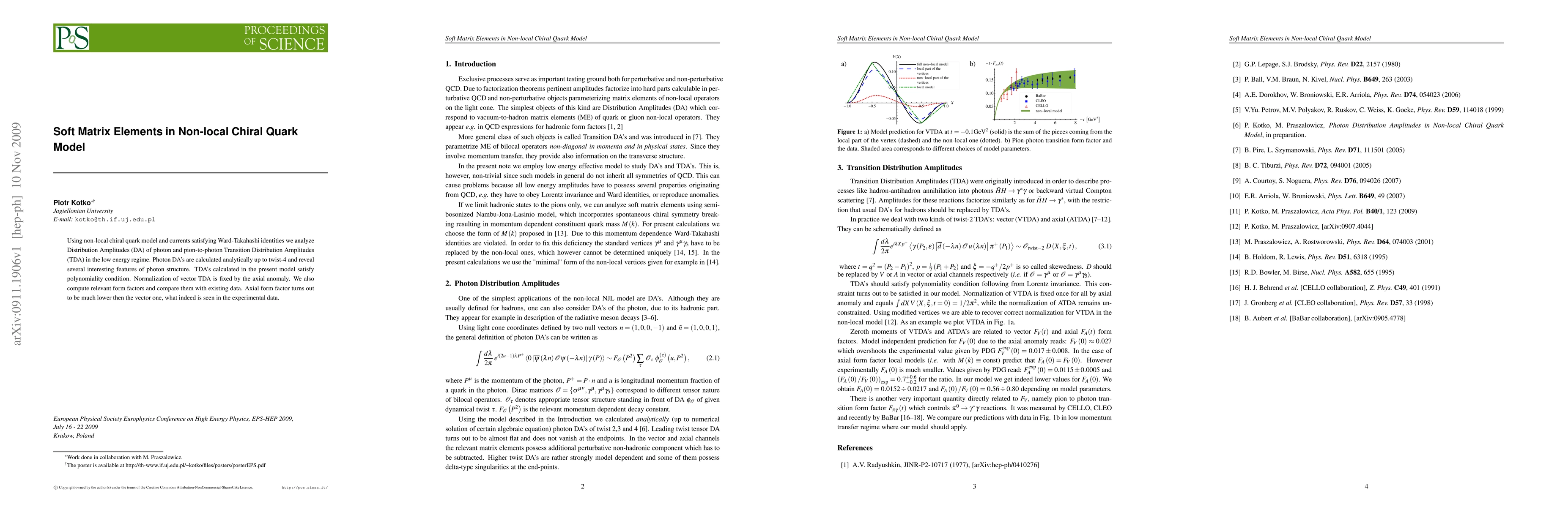 This paper uses a non-local chiral quark model to analyze the distribution amplitudes of photons and pion-to-photon transition distribution amplitudes, revealing interesting features of photon structure and satisfying polynomiality conditions. The axial form factor is found to be significantly lower than the vector form factor, consistent with experimental observations.