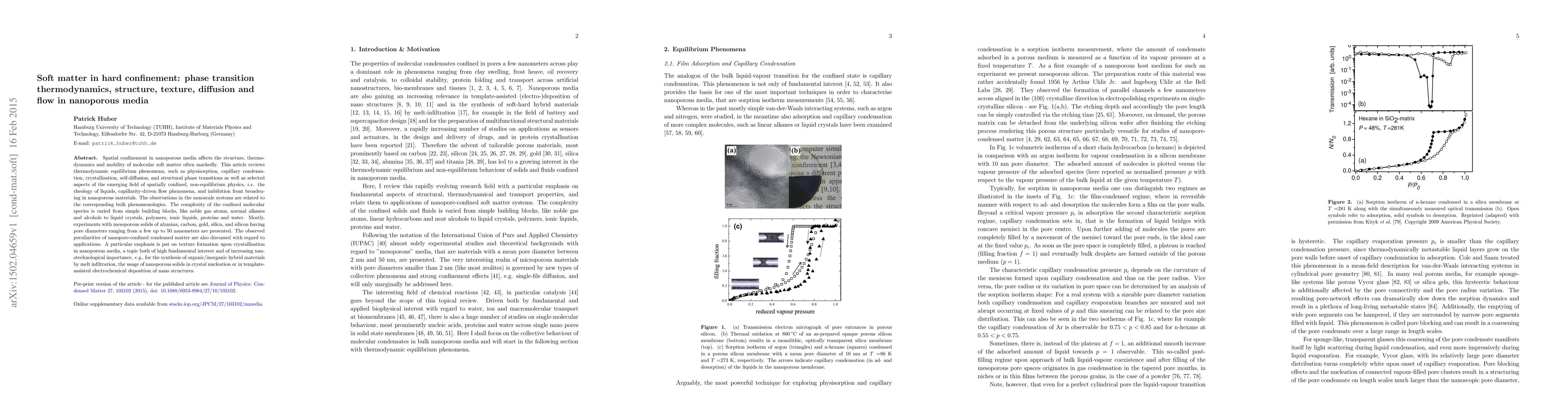 This review explores the thermodynamic and structural behaviors of soft matter confined within nanoporous media, focusing on phenomena like physisorption, capillary condensation, and crystallization. It examines both equilibrium and non-equilibrium physics, including rheology and flow dynamics, and discusses applications in nanotechnology and material synthesis.