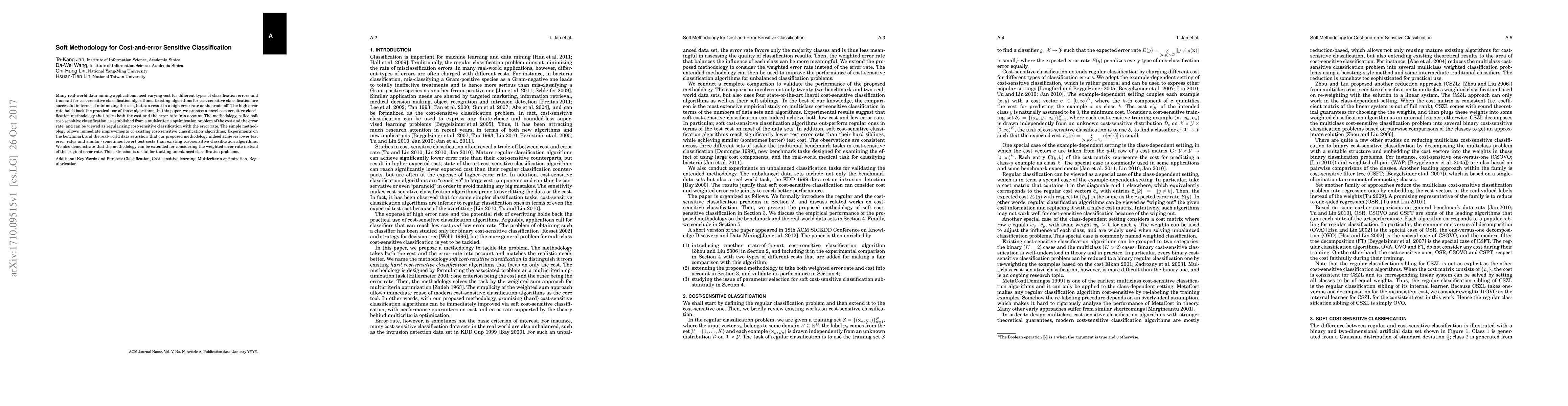 This paper introduces a novel soft cost-sensitive classification methodology that optimizes both cost and error rate, thereby improving existing algorithms' performance by achieving lower error rates while maintaining competitive cost efficiency. The proposed methodology can also be extended to handle unbalanced classification problems by considering weighted error rates.