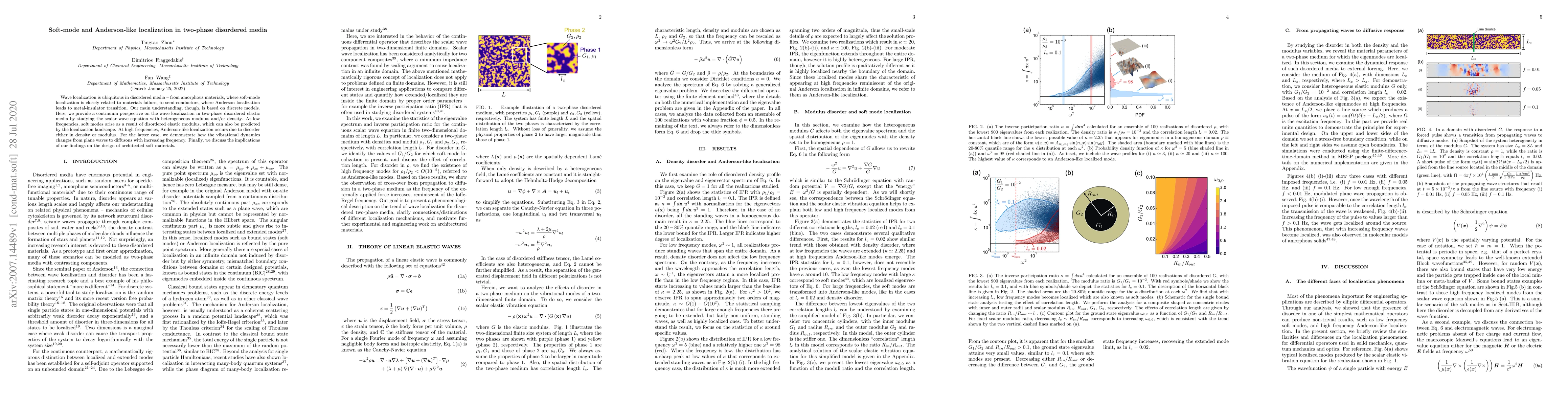 This paper explores wave localization in two-phase disordered elastic media, identifying soft-mode localization at low frequencies and Anderson-like localization at high frequencies due to modulus or density disorder. The study provides a continuum perspective on these phenomena and discusses their implications for designing advanced materials.