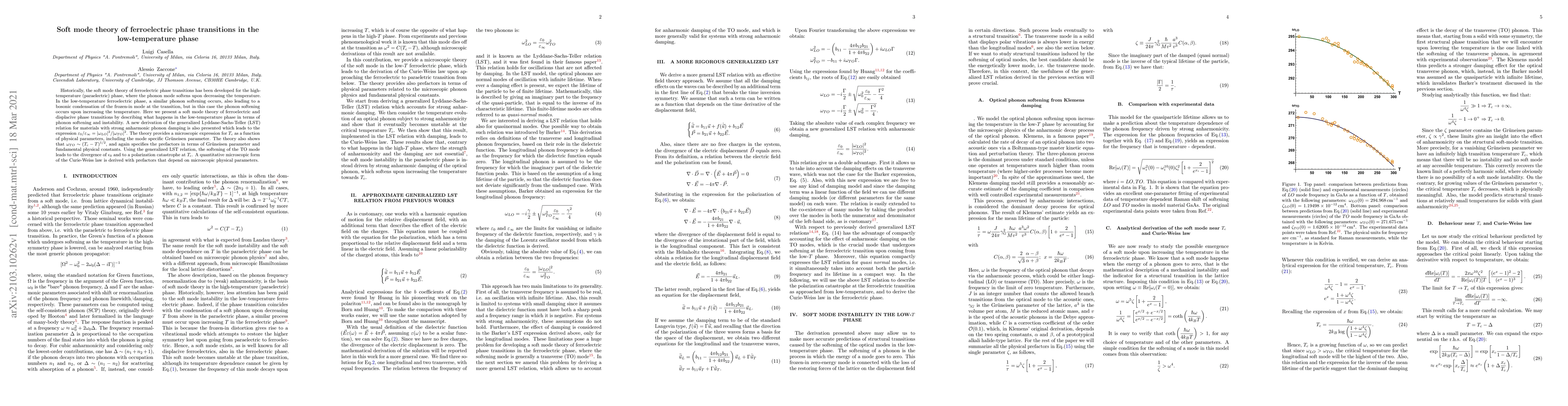 This paper develops a soft mode theory for ferroelectric phase transitions in the low-temperature phase, describing phonon softening and instability leading to bosonic condensation. It presents a new derivation of the generalized Lyddane-Sachs-Teller relation and provides a microscopic expression for the transition temperature $T_c$ in terms of the Gr\"uneisen parameter and fundamental physical constants.