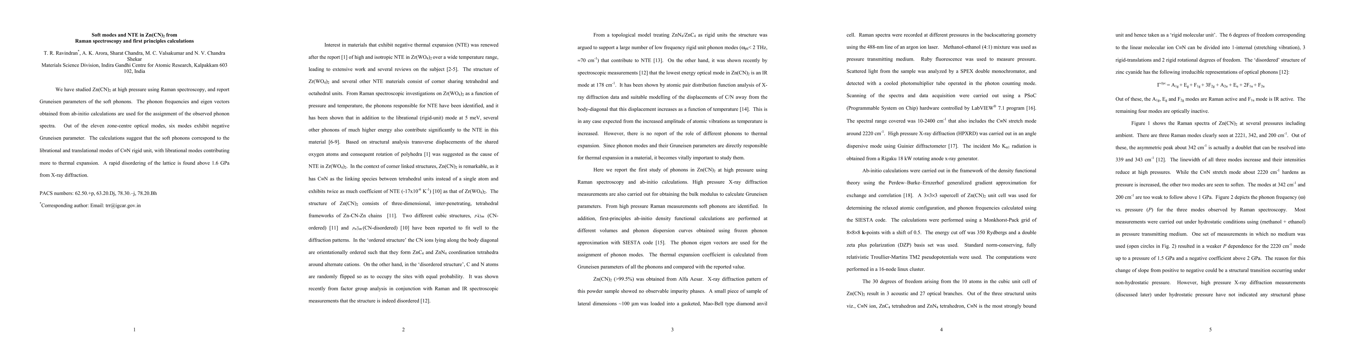 We have studied Zn(CN)2 at high pressure using Raman spectroscopy, and report Gruneisen parameters of the soft phonons. The phonon frequencies and eigen vectors obtained from ab-initio calculations are used for the assignment of the observed phonon spectra. Out of the eleven zone-centre optical modes, six modes exhibit negative Gruneisen parameter. The calculations suggest that the soft phonons correspond to the librational and translational modes of CN rigid unit, with librational modes contributing more to thermal expansion. A rapid disordering of the lattice is found above 1.6 GPa from X-ray diffraction.