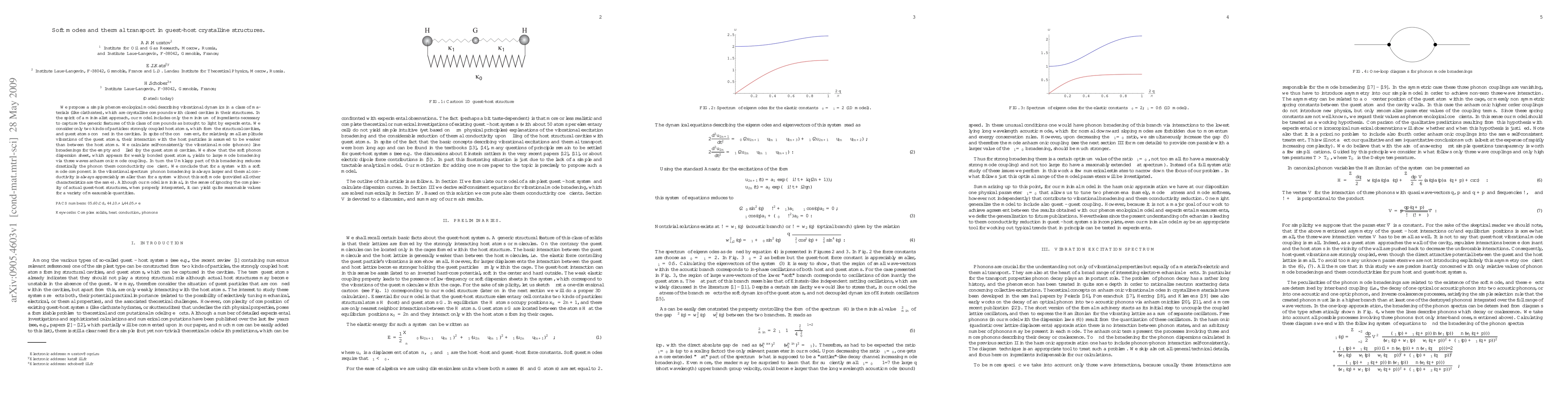 We propose a simple phenomenological model describing vibrational dynamics in a class of materials (like clathrates), which are crystalline compounds with closed cavities in their structures. In the spirit of a minimalist approach, our model includes only the minimum of ingredients necessary to capture the generic features of this class of compounds as brought to light by experiments. We consider only two kinds of particles: strongly coupled host atoms, which form the structural cavities, and guest atoms confined in the cavities. In spite of the confinement, for relatively small amplitude vibrations of the guest atoms, their interaction with the host particles is assumed to be weaker than between the host atoms. We calculate self-consistently the vibrational mode (phonon) line broadenings for the empty and filled (by the guest atoms) cavities. We show that the soft phonon dispersion sheet, which appears for weakly bonded guest atoms, yields to large mode broadening via three waves anharmonic mode coupling. In turn the Umklapp part of this broadening reduces drastically the phonon thermoconductivity coefficient. We conclude that for a system with a soft mode component in the vibrational spectrum phonon broadening is always larger and thermal conductivity is always appreciably smaller than for a system without this soft mode (provided all other characteristics are the same). Although our model is minimal, in the sense of ignoring the complexity of actual guest-host structures, when properly interpreted, it can yield quite reasonable values for a variety of measurable quantities.