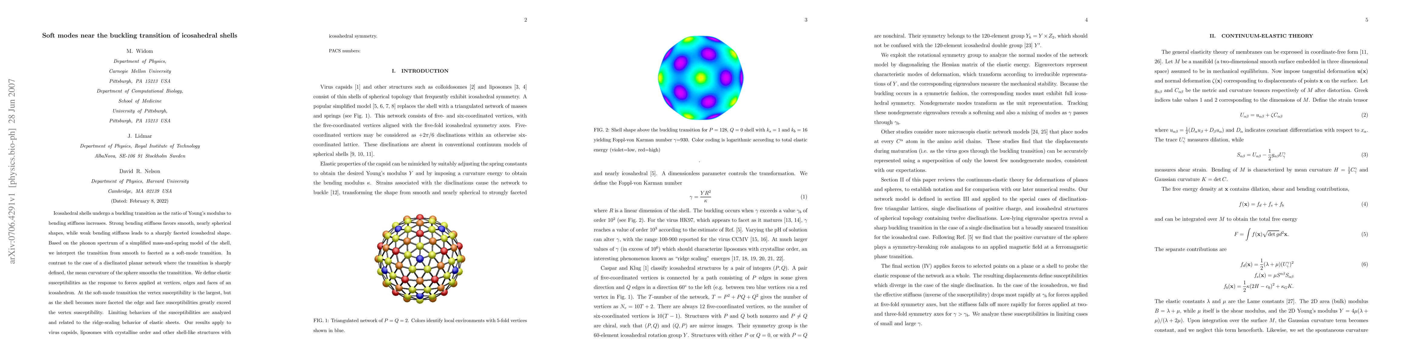 Icosahedral shells undergo a buckling transition as the ratio of Young's modulus to bending stiffness increases. Strong bending stiffness favors smooth, nearly spherical shapes, while weak bending stiffness leads to a sharply faceted icosahedral shape. Based on the phonon spectrum of a simplified mass-and-spring model of the shell, we interpret the transition from smooth to faceted as a soft-mode transition. In contrast to the case of a disclinated planar network where the transition is sharply defined, the mean curvature of the sphere smooths the transitition. We define elastic susceptibilities as the response to forces applied at vertices, edges and faces of an icosahedron. At the soft-mode transition the vertex susceptibility is the largest, but as the shell becomes more faceted the edge and face susceptibilities greatly exceed the vertex susceptibility. Limiting behaviors of the susceptibilities are analyzed and related to the ridge-scaling behavior of elastic sheets. Our results apply to virus capsids, liposomes with crystalline order and other shell-like structures with icosahedral symmetry.
