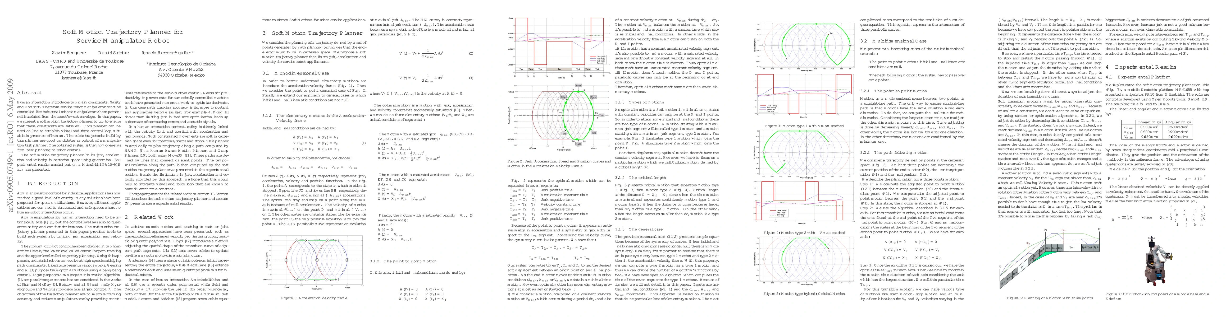 Human interaction introduces two main constraints: Safety and Comfort. Therefore service robot manipulator can't be controlled like industrial robotic manipulator where personnel is isolated from the robot's work envelope. In this paper, we present a soft motion trajectory planner to try to ensure that these constraints are satisfied. This planner can be used on-line to establish visual and force control loop suitable in presence of human. The cubic trajectories build by this planner are good candidates as output of a manipulation task planner. The obtained system is then homogeneous from task planning to robot control. The soft motion trajectory planner limits jerk, acceleration and velocity in cartesian space using quaternion. Experimental results carried out on a Mitsubishi PA10-6CE arm are presented.