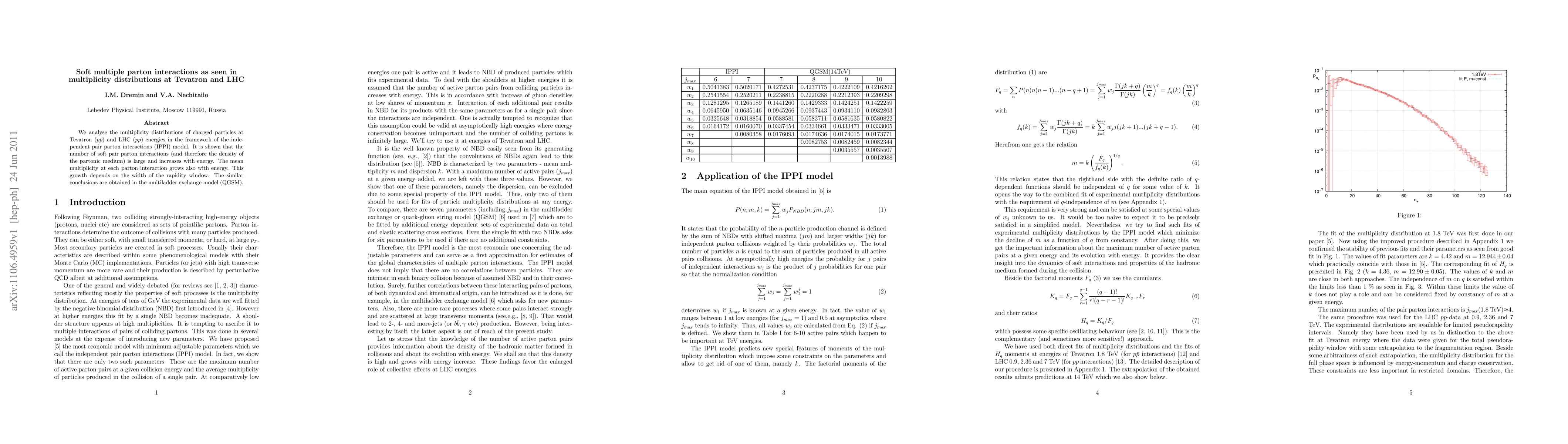 Summary: The study analyzes charged particle multiplicity distributions at Tevatron and LHC energies using the IPPI model, revealing a significant increase in soft parton interactions and partonic medium density with energy, with a growing mean multiplicity per interaction that correlates with the rapidity window width. Similar findings are confirmed by the multiladder exchange model (QGSM).