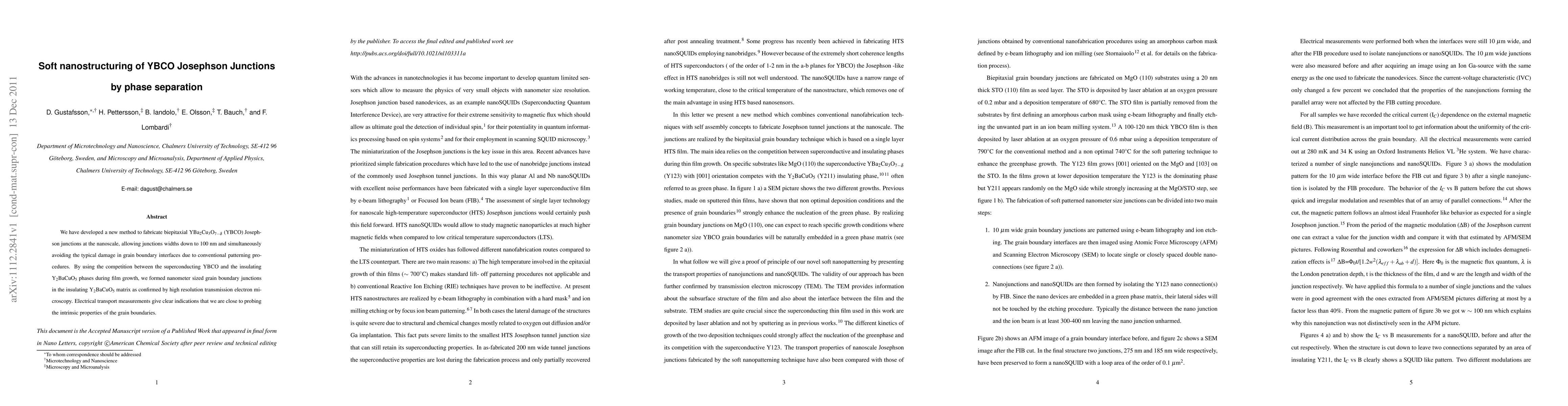 This paper presents a novel method for creating nanoscale YBCO Josephson junctions via phase separation, achieving junctions as small as 100 nm without damaging grain boundary interfaces. The technique leverages the competition between superconducting and insulating phases during film growth, confirmed by high-resolution microscopy, and shows promising intrinsic grain boundary properties.