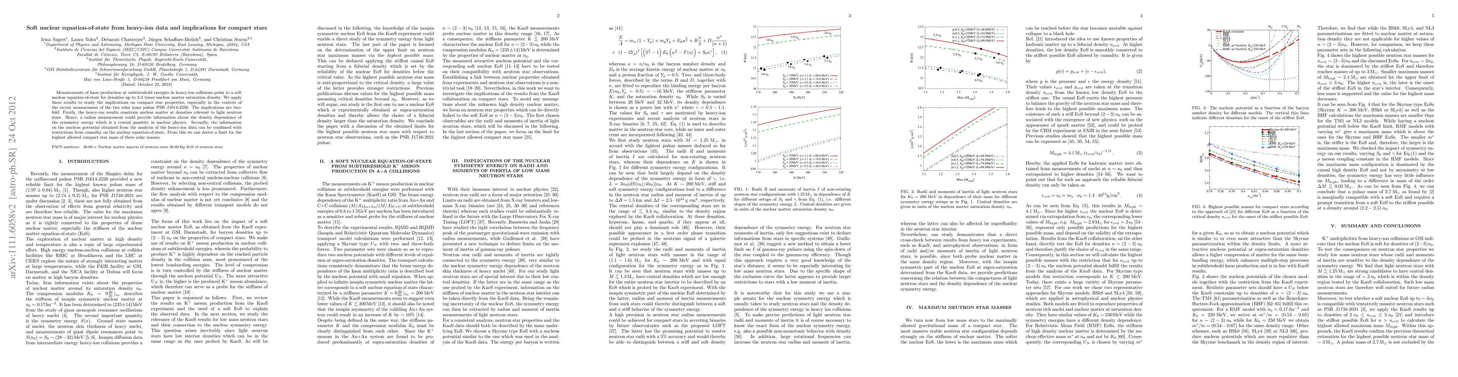 Measurements of kaon production at subthreshold energies in heavy-ion collisions point to a soft nuclear equation-of-state for densities up to 2-3 times nuclear matter saturation density. We apply these results to study the implications on compact star properties, especially in the context of the recent measurement of the two solar mass pulsar PSR J1614-2230. The implications are two-fold: Firstly, the heavy-ion results constrain nuclear matter at densities relevant to light neutron stars. Hence, a radius measurement could provide information about the density dependence of the symmetry energy which is a crucial quantity in nuclear physics. Secondly, the information on the nucleon potential obtained from the analysis of the heavy-ion data can be combined with restrictions from causality on the nuclear equation-of-state. From this we can derive a limit for the highest allowed compact star mass of three solar masses.