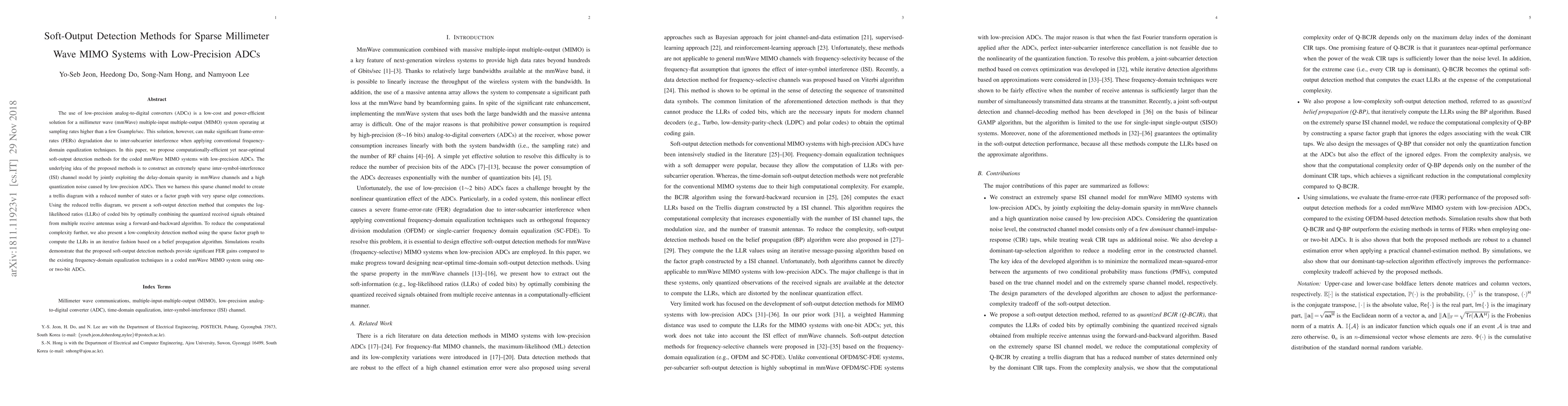 This paper proposes computationally-efficient soft-output detection methods for sparse millimeter wave MIMO systems with low-precision ADCs, leveraging delay-domain sparsity and quantization noise to create reduced trellis diagrams and sparse factor graphs for optimal bit-level signal processing. The proposed methods achieve significant frame-error-rate gains over conventional frequency-domain equalization techniques.