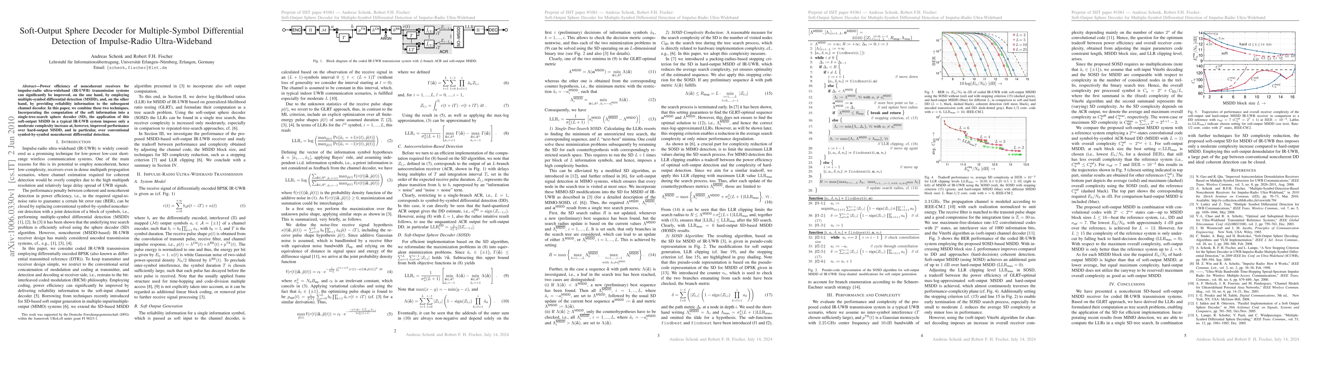 This paper presents a soft-output sphere decoder for multiple-symbol differential detection in impulse-radio ultra-wideband systems, combining improved power efficiency and reliability information for channel decoding, resulting in enhanced performance with only a moderate complexity increase.