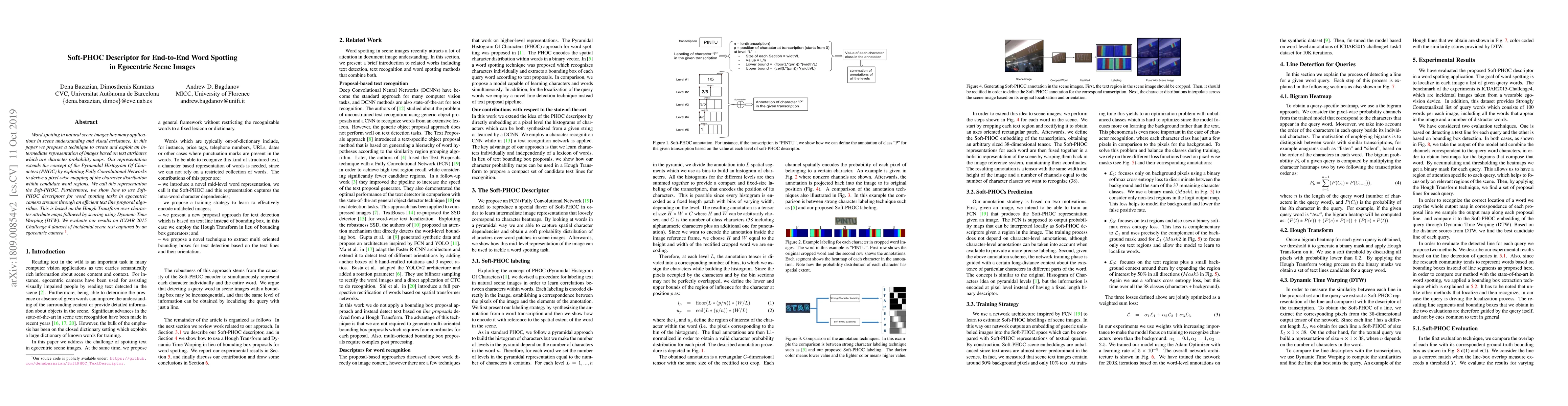 Word spotting in natural scene images has many applications in scene understanding and visual assistance. In this paper we propose a technique to create and exploit an intermediate representation of images based on text attributes which are character probability maps. Our representation extends the concept of the Pyramidal Histogram Of Characters (PHOC) by exploiting Fully Convolutional Networks to derive a pixel-wise mapping of the character distribution within candidate word regions. We call this representation the Soft-PHOC. Furthermore, we show how to use Soft-PHOC descriptors for word spotting tasks in egocentric camera streams through an efficient text line proposal algorithm. This is based on the Hough Transform over character attribute maps followed by scoring using Dynamic Time Warping (DTW). We evaluate our results on ICDAR 2015 Challenge 4 dataset of incidental scene text captured by an egocentric camera.
