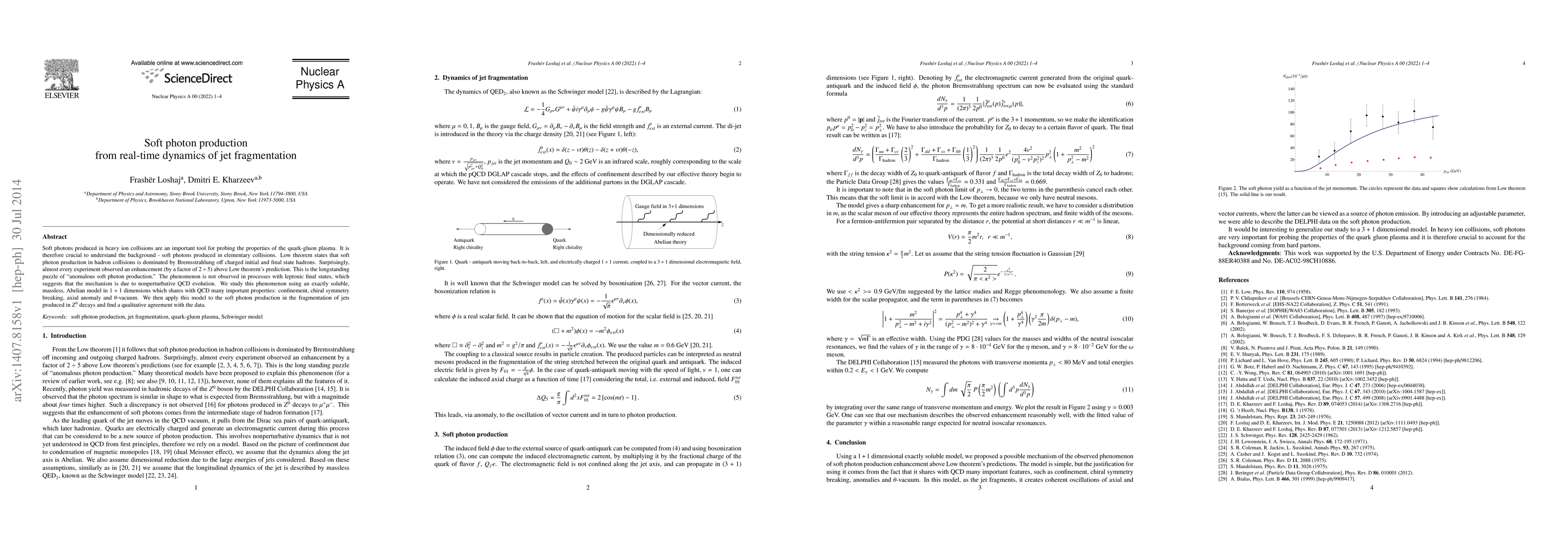Soft photons produced in heavy ion collisions are an important tool for probing the properties of the quark-gluon plasma. It is therefore crucial to understand the background - soft photons produced in elementary collisions. Low theorem states that soft photon production in hadron collisions is dominated by Bremsstrahlung off charged initial and final state hadrons. Surprisingly, almost every experiment observed an enhancement (by a factor of $2\div 5$) above Low theorem's prediction. This is the longstanding puzzle of "anomalous soft photon production." The phenomenon is not observed in processes with leptonic final states, which suggests that the mechanism is due to nonperturbative QCD evolution. We study this phenomenon using an exactly soluble, massless, Abelian model in $1+1$ dimensions which shares with QCD many important properties: confinement, chiral symmetry breaking, axial anomaly and $\theta$-vacuum. We then apply this model to the soft photon production in the fragmentation of jets produced in $Z^0$ decays and find a qualitative agreement with the data.