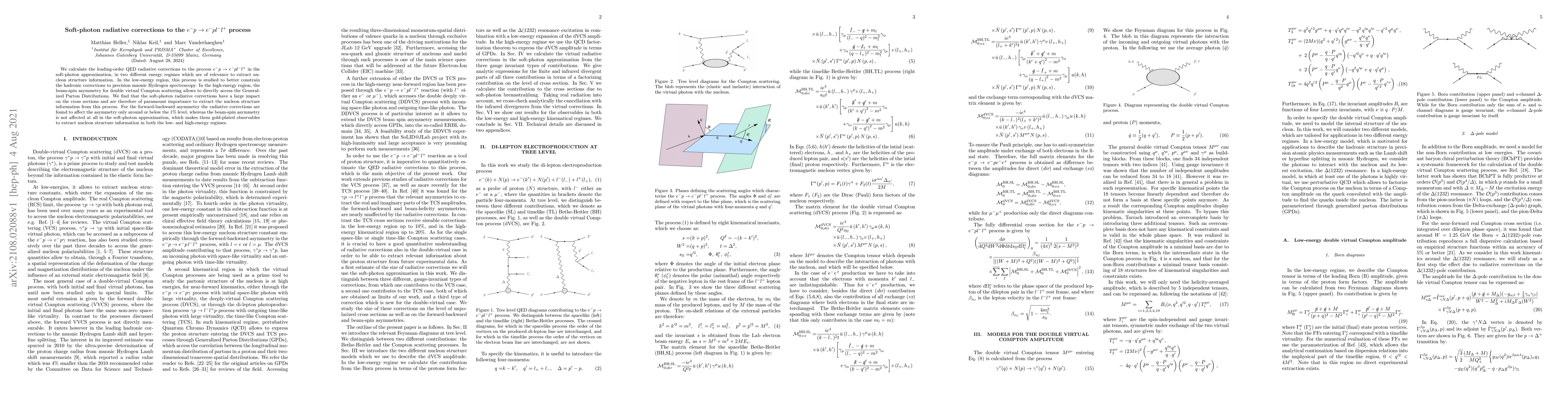 We calculate the leading-order QED radiative corrections to the process $e^- p\rightarrow e^- p l^- l^+ $ in the soft-photon approximation, in two different energy regimes which are of relevance to extract nucleon structure information. In the low-energy region, this process is studied to better constrain the hadronic corrections to precision muonic Hydrogen spectroscopy. In the high-energy region, the beam-spin asymmetry for double virtual Compton scattering allows to directly access the Generalized Parton Distributions. We find that the soft-photon radiative corrections have a large impact on the cross sections and are therefore of paramount importance to extract the nucleon structure information from this process. For the forward-backward asymmetry the radiative corrections are found to affect the asymmetry only around or below the 1\% level, whereas the beam-spin asymmetry is not affected at all in the soft-photon approximation, which makes them gold-plated observables to extract nucleon structure information in both the low- and high-energy regimes.