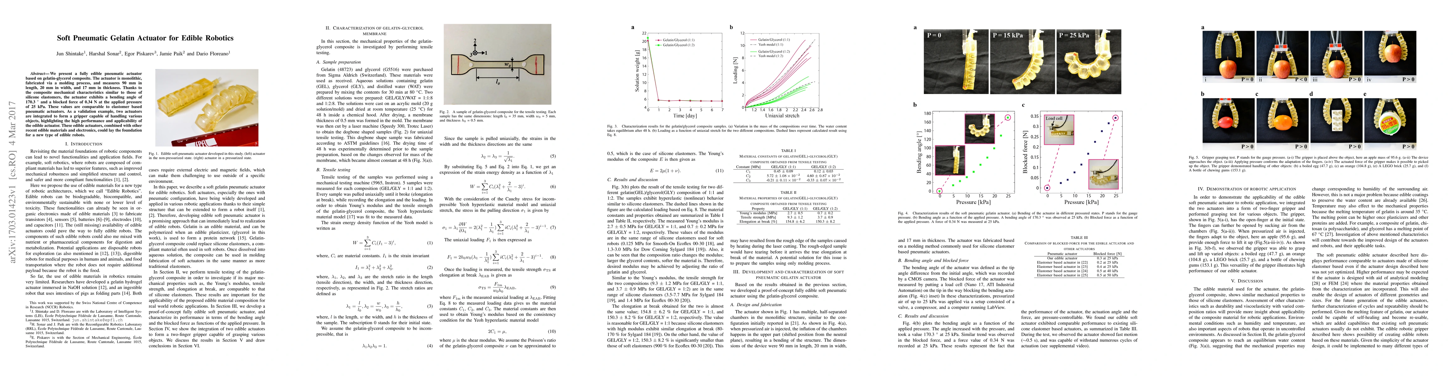 This paper introduces an edible pneumatic actuator made from a gelatin-glycerol composite, demonstrating comparable performance to silicone elastomers in bending and force. The actuators are used to create an edible gripper, showcasing potential for edible robotics.