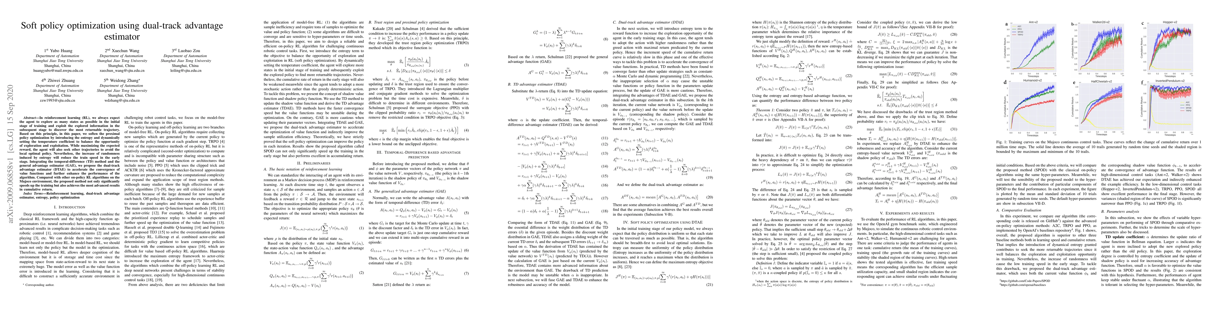 In reinforcement learning (RL), we always expect the agent to explore as many states as possible in the initial stage of training and exploit the explored information in the subsequent stage to discover the most returnable trajectory. Based on this principle, in this paper, we soften the proximal policy optimization by introducing the entropy and dynamically setting the temperature coefficient to balance the opportunity of exploration and exploitation. While maximizing the expected reward, the agent will also seek other trajectories to avoid the local optimal policy. Nevertheless, the increase of randomness induced by entropy will reduce the train speed in the early stage. Integrating the temporal-difference (TD) method and the general advantage estimator (GAE), we propose the dual-track advantage estimator (DTAE) to accelerate the convergence of value functions and further enhance the performance of the algorithm. Compared with other on-policy RL algorithms on the Mujoco environment, the proposed method not only significantly speeds up the training but also achieves the most advanced results in cumulative return.