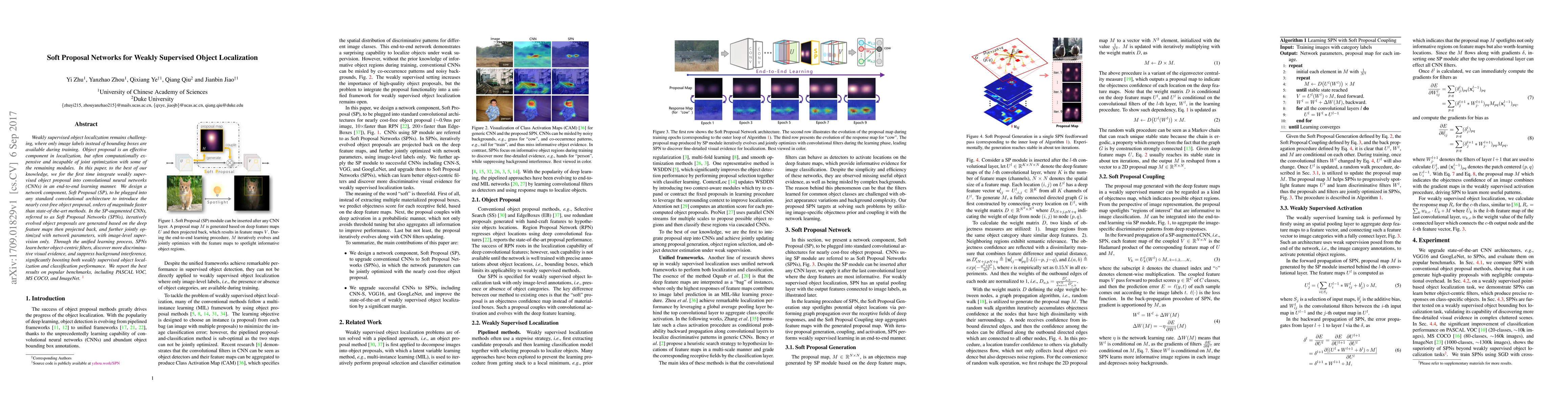 This paper introduces Soft Proposal Networks (SPNs) that integrate weakly supervised object proposal into CNNs for efficient and effective object localization using only image labels. The proposed Soft Proposal (SP) component enables rapid, cost-effective object proposals and significantly enhances localization and classification performance on benchmarks like PASCAL VOC, MS COCO, and ImageNet.