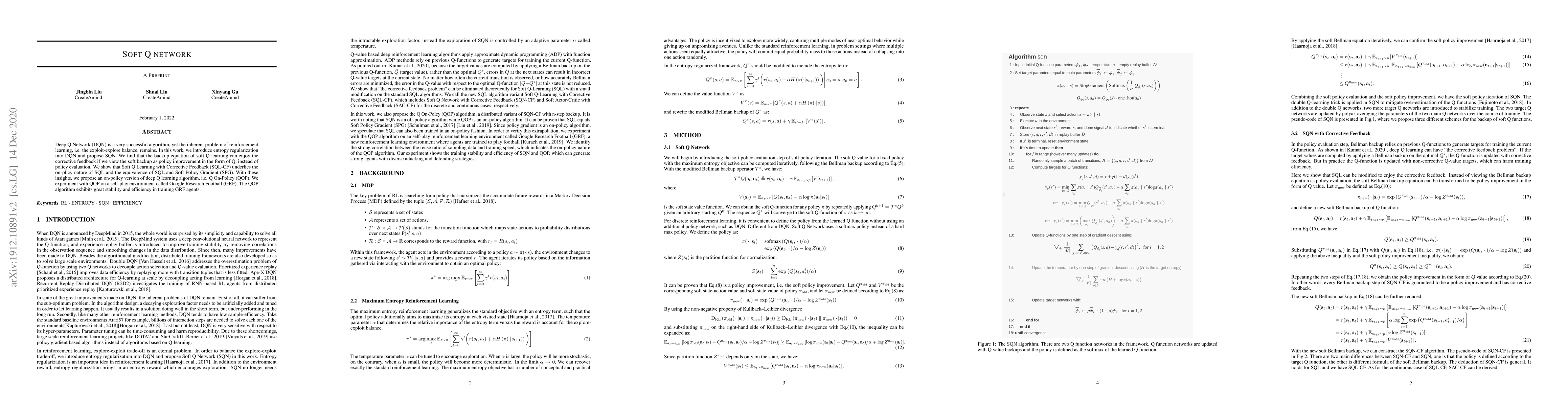 Deep Q Network (DQN) is a very successful algorithm, yet the inherent problem of reinforcement learning, i.e. the exploit-explore balance, remains. In this work, we introduce entropy regularization into DQN and propose SQN. We find that the backup equation of soft Q learning can enjoy the corrective feedback if we view the soft backup as policy improvement in the form of Q, instead of policy evaluation. We show that Soft Q Learning with Corrective Feedback (SQL-CF) underlies the on-plicy nature of SQL and the equivalence of SQL and Soft Policy Gradient (SPG). With these insights, we propose an on-policy version of deep Q learning algorithm, i.e. Q On-Policy (QOP). We experiment with QOP on a self-play environment called Google Research Football (GRF). The QOP algorithm exhibits great stability and efficiency in training GRF agents.